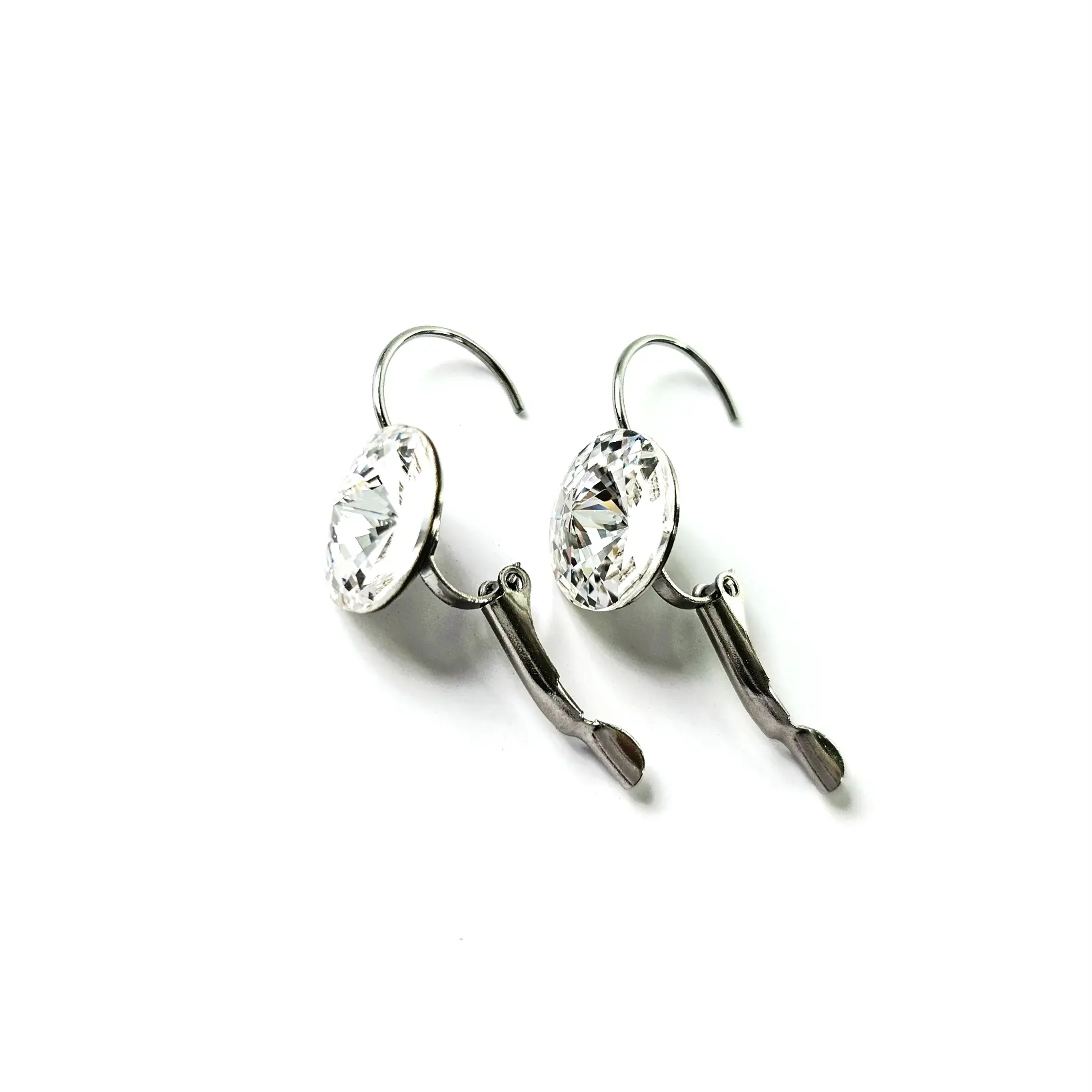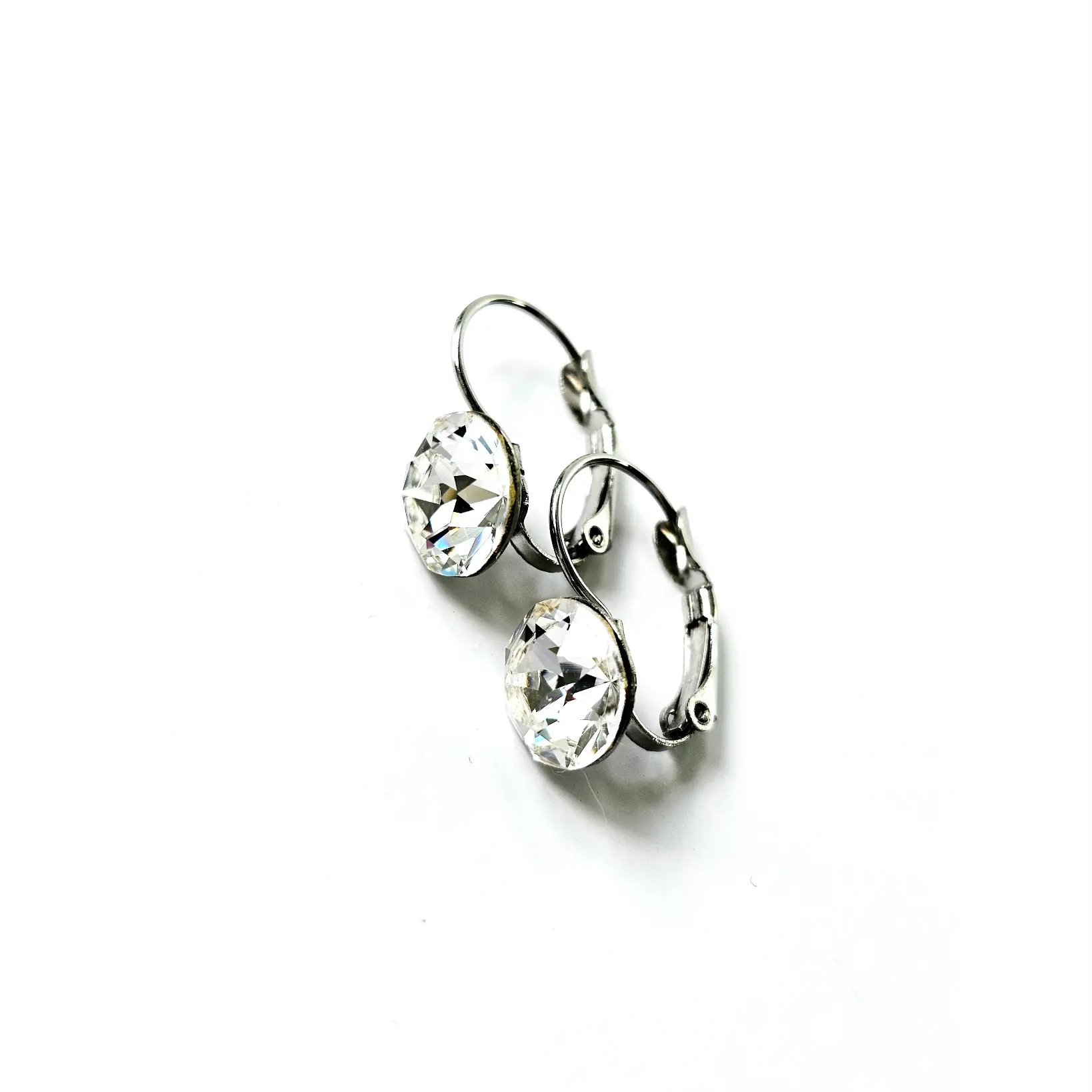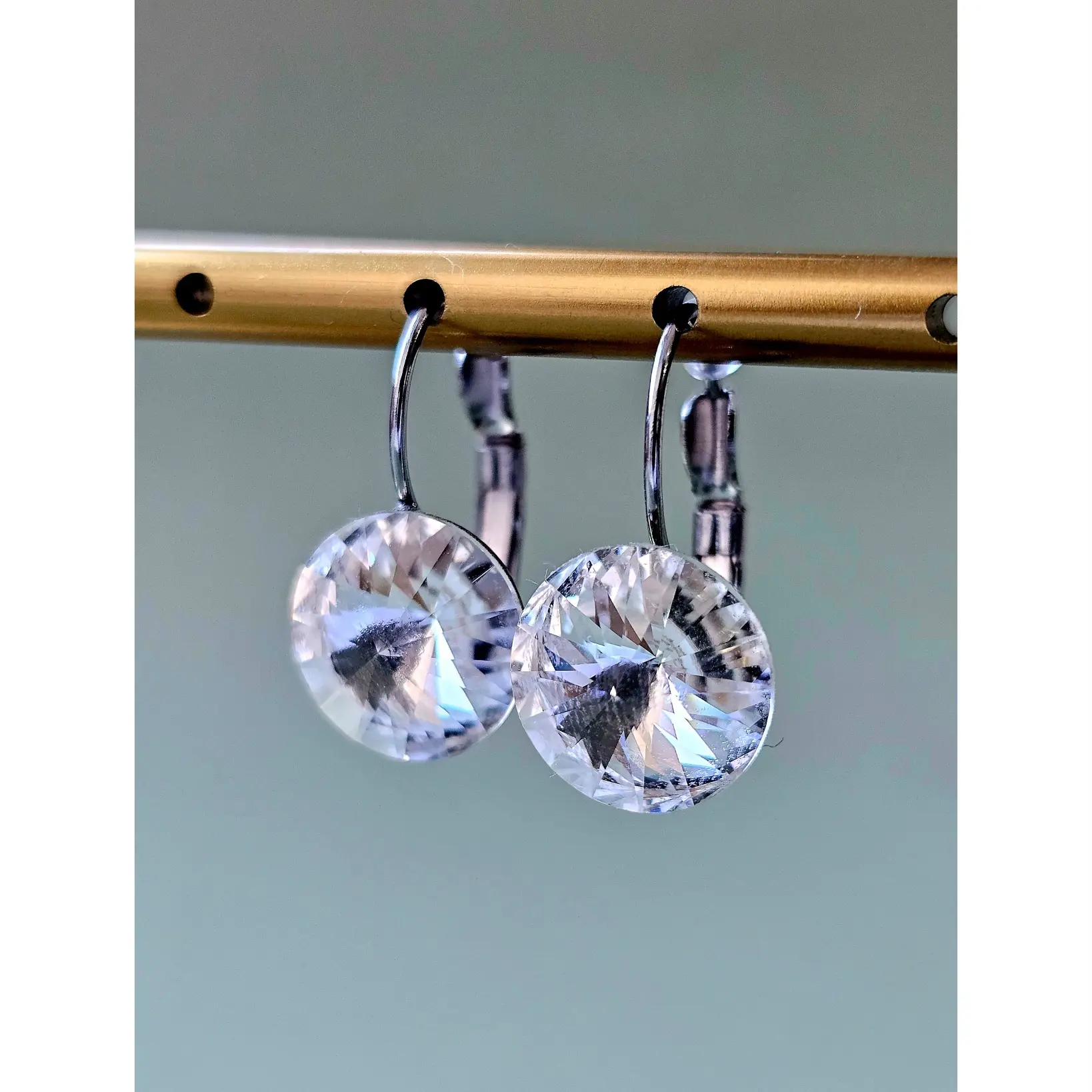 Blago viseće naušnice brenda Djidji & Co koristite za svakodnevne te poslovne ili svečane prilike. Okrugli kamen u osnovnoj, bezbojnoj varijanti, očarava veličinom i lepezastim fasetima čineći da zasija i pod minimalnim izvorom svjetlosti. Ukalupljen u originalne metalne komponente platinastog tona bez premaza, sa sigurnosnim kopčanjem. Kopčanje je široko, sigurno i udobno. Namijenjene za svakodnevne situacije, pored vrhunski fasetiranih kristala, ove naušnice krase hipoalergenske komponente otporne na uvjete te lako održavanje u kućnim uvjetima. Dužina naušnica je 22mm, širina je 12mm.