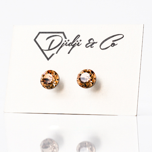 Naušnice sa kačenjem na šaraf iz Djidji & Co Fancy Casual kolekcije namijenjene za svakodnevno nošenje. Vrhunski fasetiran za savršen odsjaj, okrugli kamen šaton u klasičnoj boji zlatnog Kolorado topaza je ukalupljen u hipoalergenske metalne komponente za dugotrajno nošenje, prikladne starijima od 16 g.  Širine 8mm, idealno se uklapaju u svakodnevna poslovna kao i minimalistička svečana izdanja. Otvorenog svjetlijeg tona, izuzetno komplementarne su plavim i bijelim dodatcima.