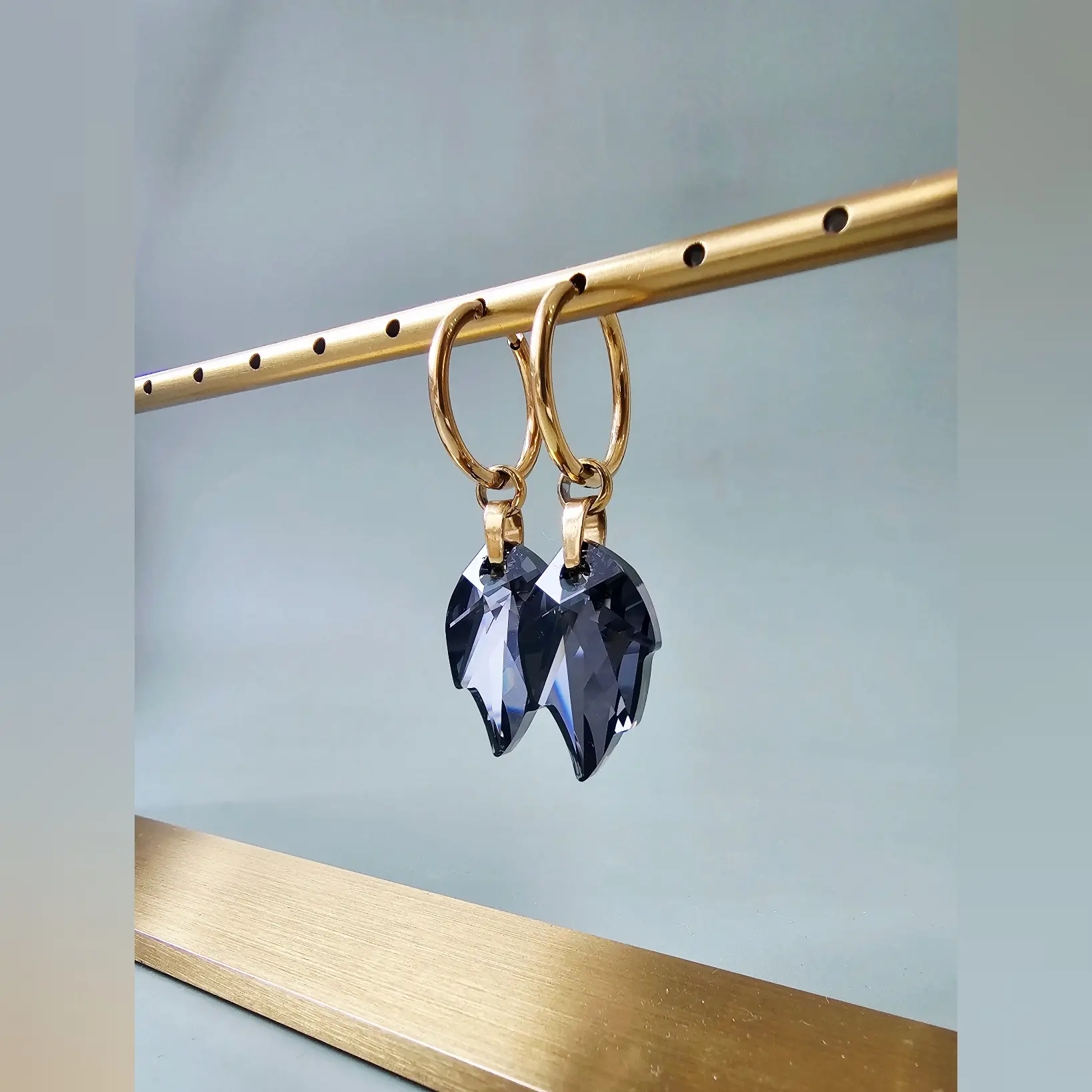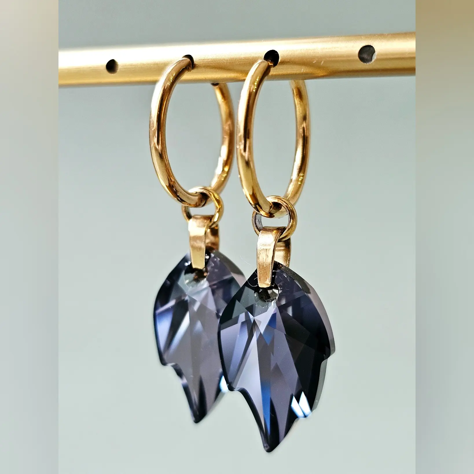 Namijenjene za svečane i psolovne prilike, pored vrhunski fasetiranih kristala, ove autentične naušnice krasi dugotrajna galvanizacija na hipoalergenskim komponentama otpornim na uvjete, efektni kristali u obliku lista te lako održavanje u kućnim uvjetima. Odlično se uklapa u kontrastu sa odjećom i modnim dodatcima tamnih i svjetlih tonova. Halke su prečnika 20mm i širine 2mm, imaju snažno kopčanje te su izrađene od hipoalergenske legure sa kvalitetnom zlatnom galvanizacijom. Ukupna dužina naušnica je 48mm što ih čini nadprosječno dugačkim ali ipak laganim za nošenje.