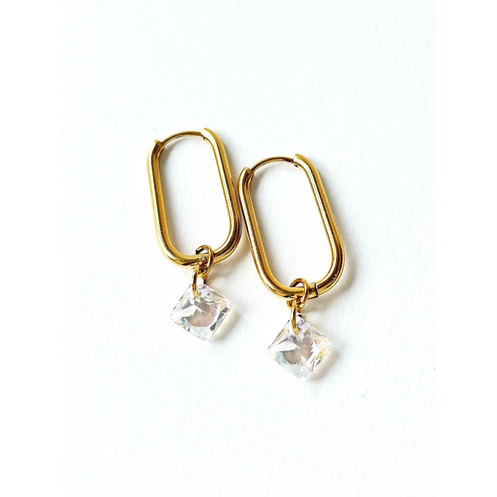 Namijenjene za svakodnevne te svečane i poslovne prilike, pored vrhunski fasetiranih kristala, ove naušnice krasi autentičnost, dugotrajna galvanizacija na hipoalergenskim komponentama otpornim na uvjete, efektni kristali u okomitom četvrtastom obliku te lako održavanje u kućnim uvjetima. Bezbojni kristali u princess fasetu sa plavičastim shimmer efektom odlično se uklapaju sa izduženim halkama zlatne boje. Nositi se mogu u kombinaciji sa odjećom i modnim dodacima kako tamnih tako i svjetlih tonova. Halke imaju snažno kopčanje te su izrađene od hipoalergenske legure sa kvalitetnom zlatnom galvanizacijom. Ukupna dužina naušnica je 34mm na halkama debljine 2mm, dok je širina istih 9mm. Namijenjene osobama starijim od 14 godina.