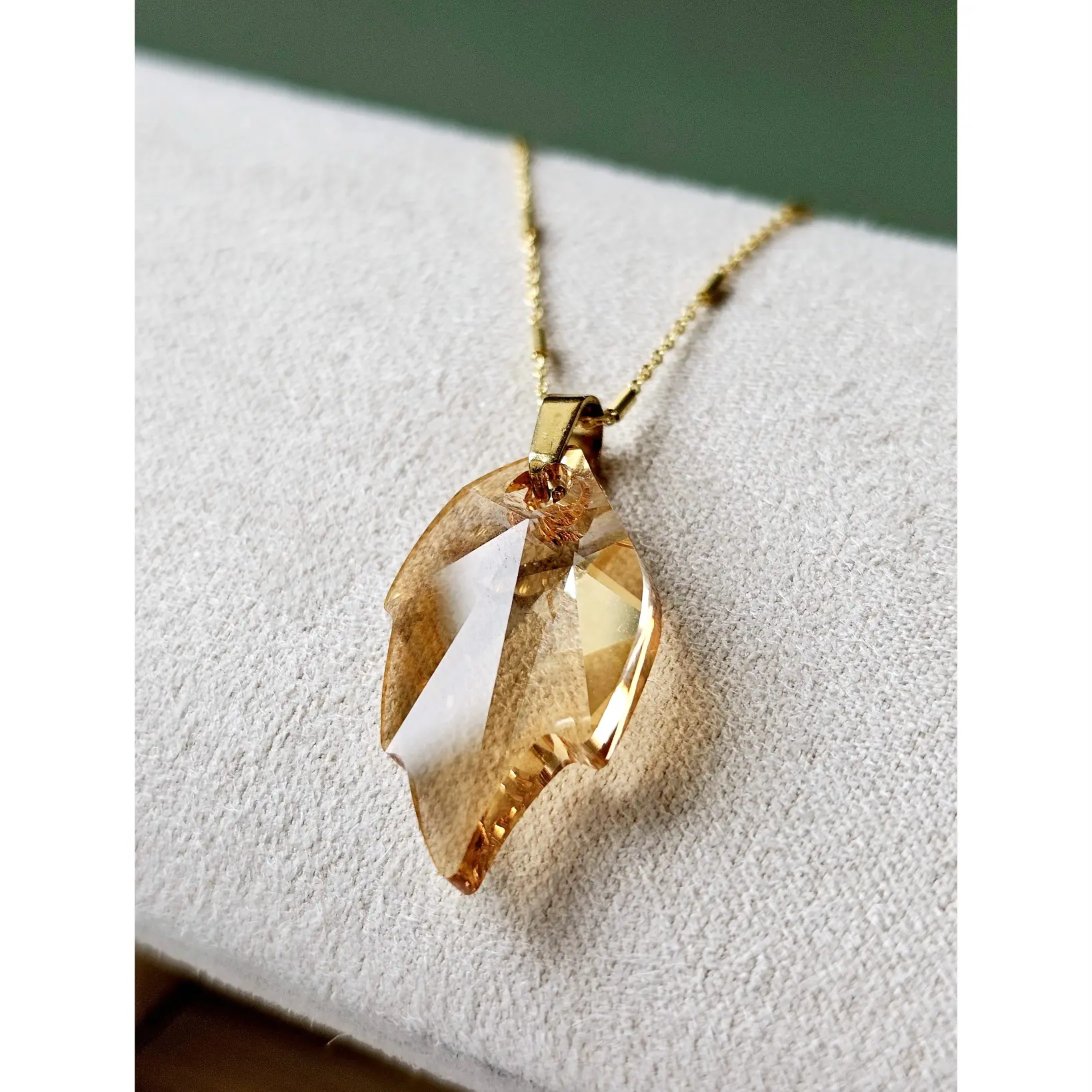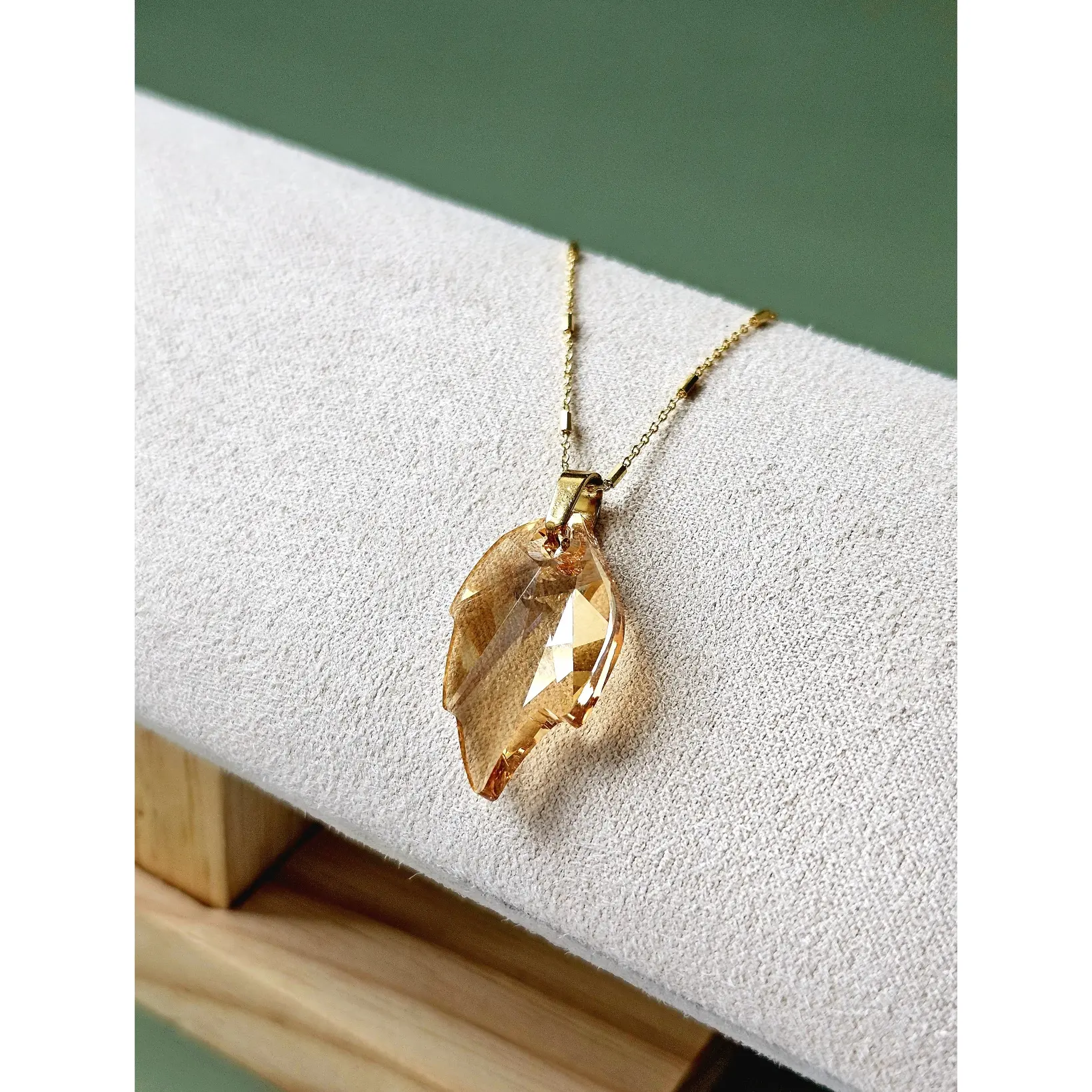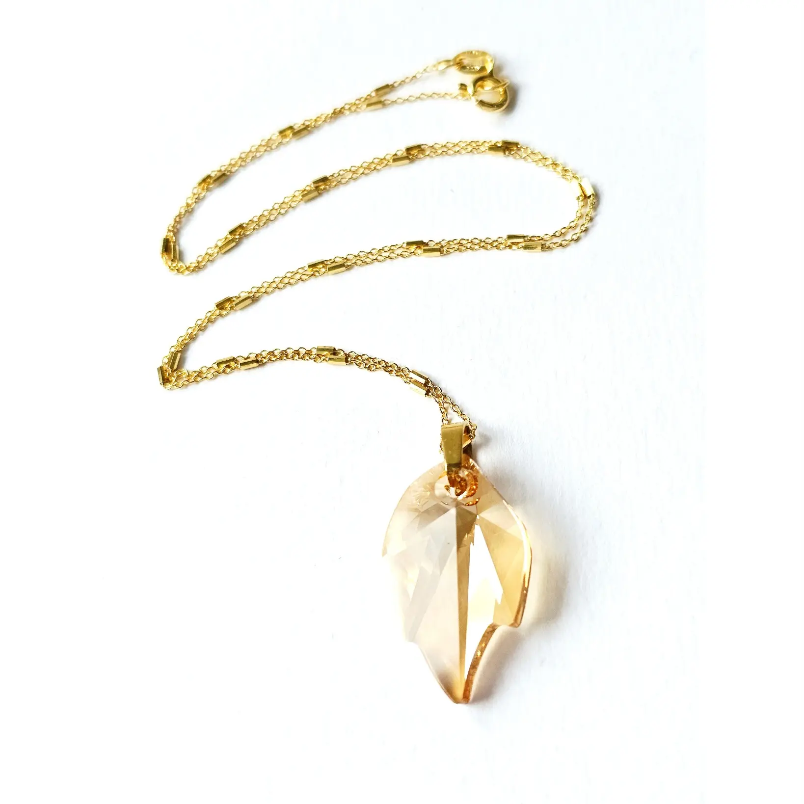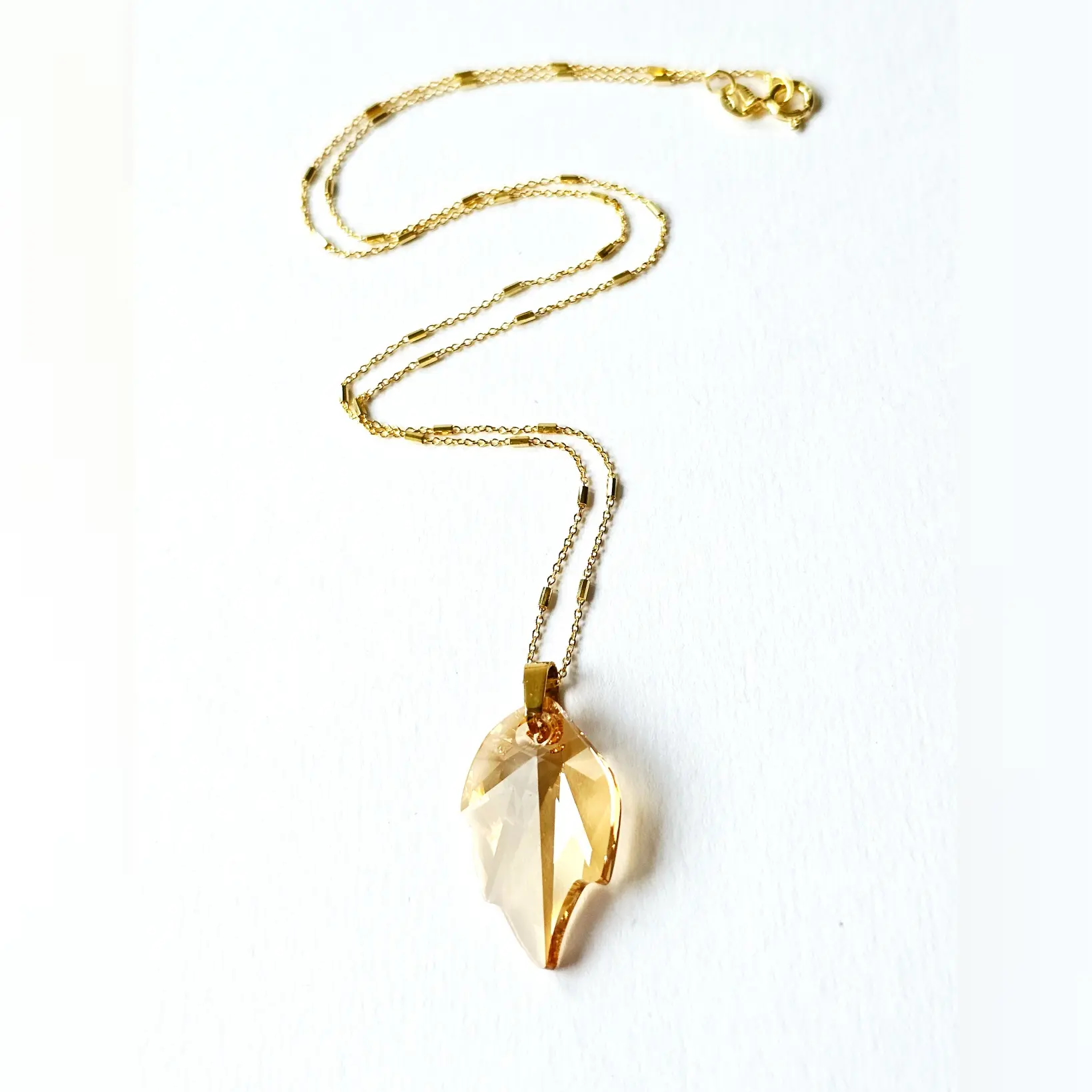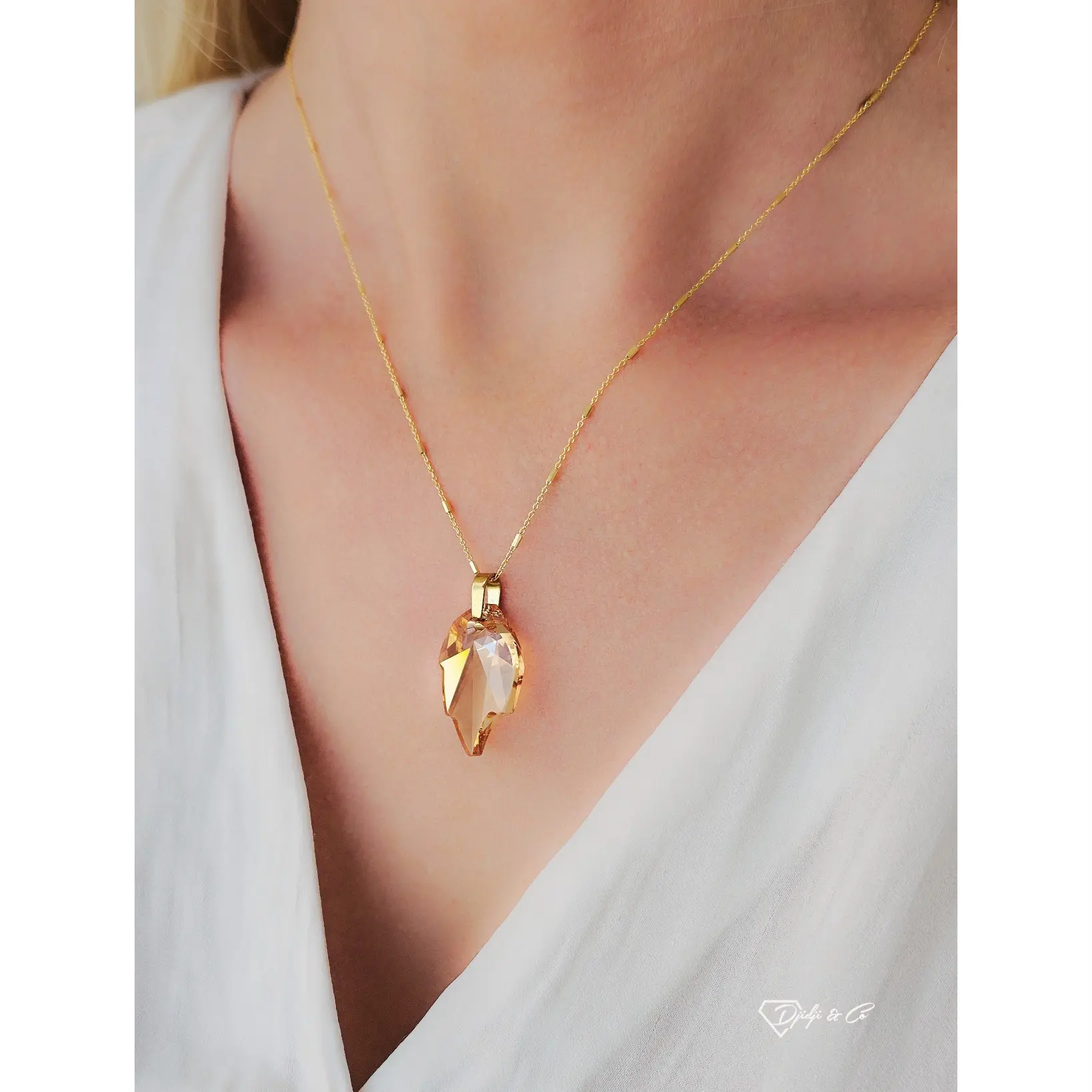 Ogrlica sa srednje velikim kristalom u obliku lista u omiljenom efektu zlatne sjene u sa box lančićem sa pozlatom unosi dozu glamura u poslovne i svečane prilike. Dužine 26mm, privjesak spada u srednje velike i jako primjetne komade. Elegantni box lančić standardne dužine 45cm i širine 2mm je izrađen od 925 srebra sa dugotrajnom zlatnom galvanizacijom.