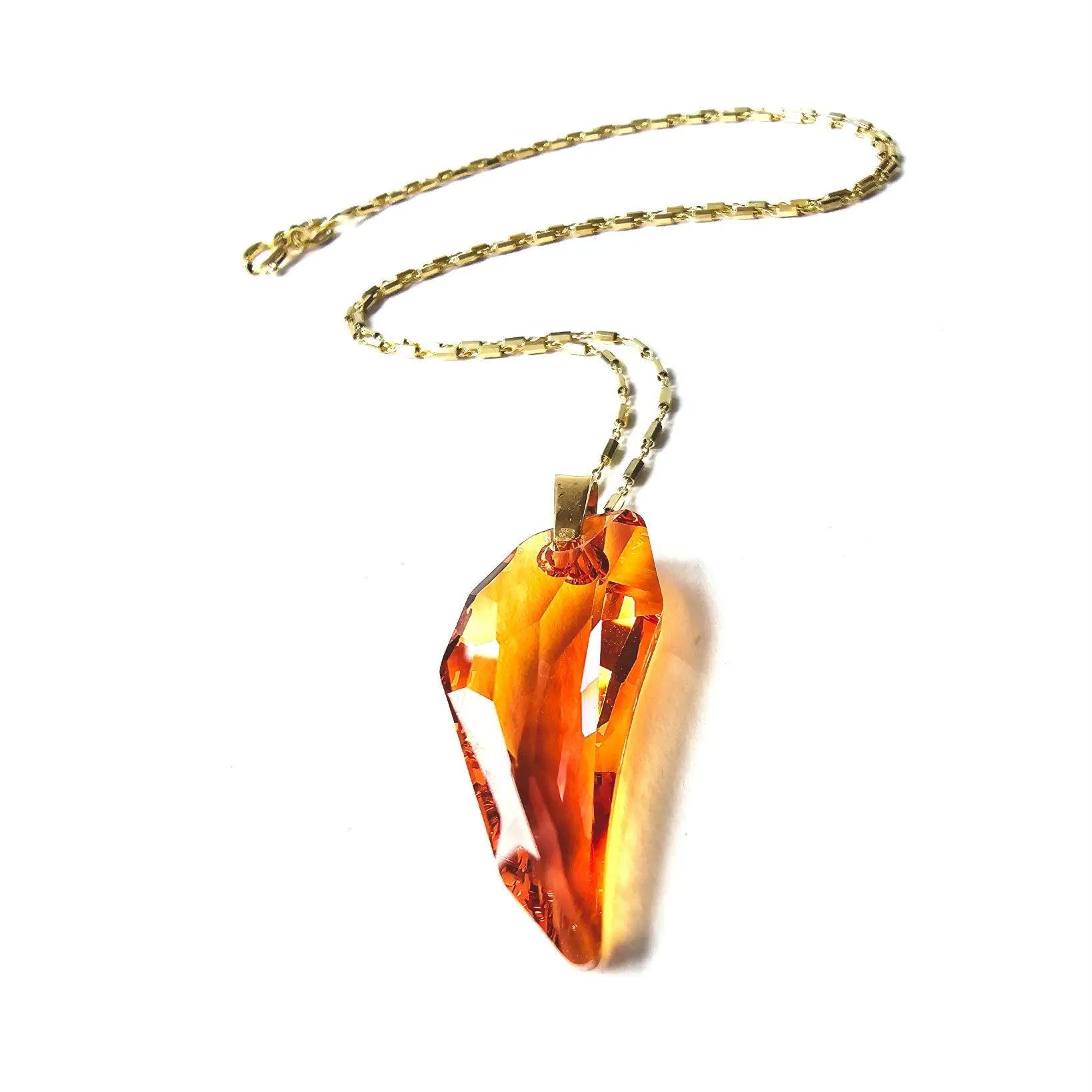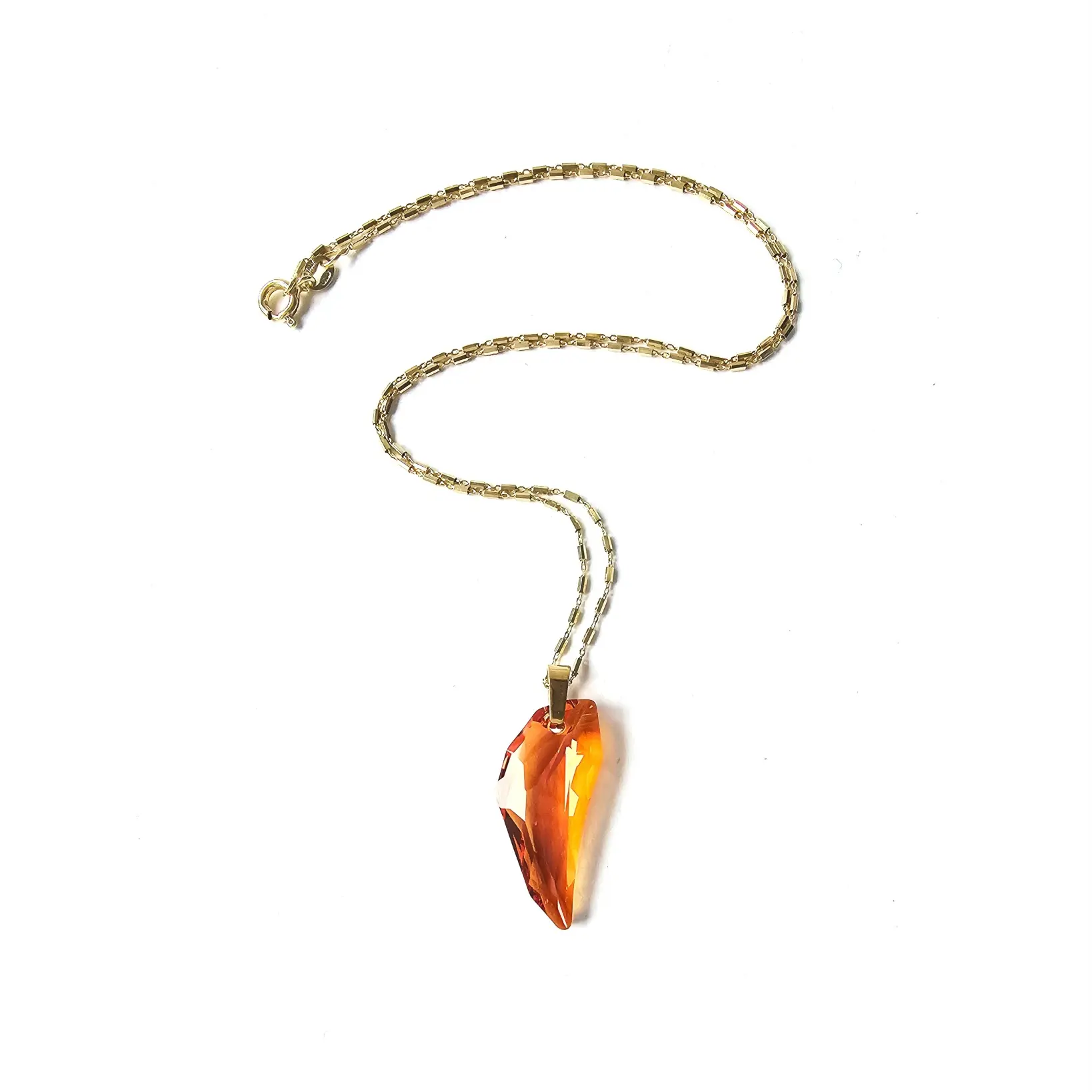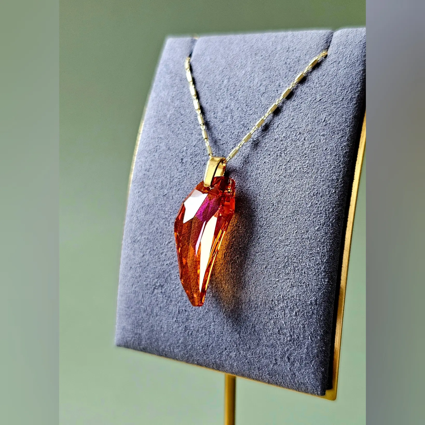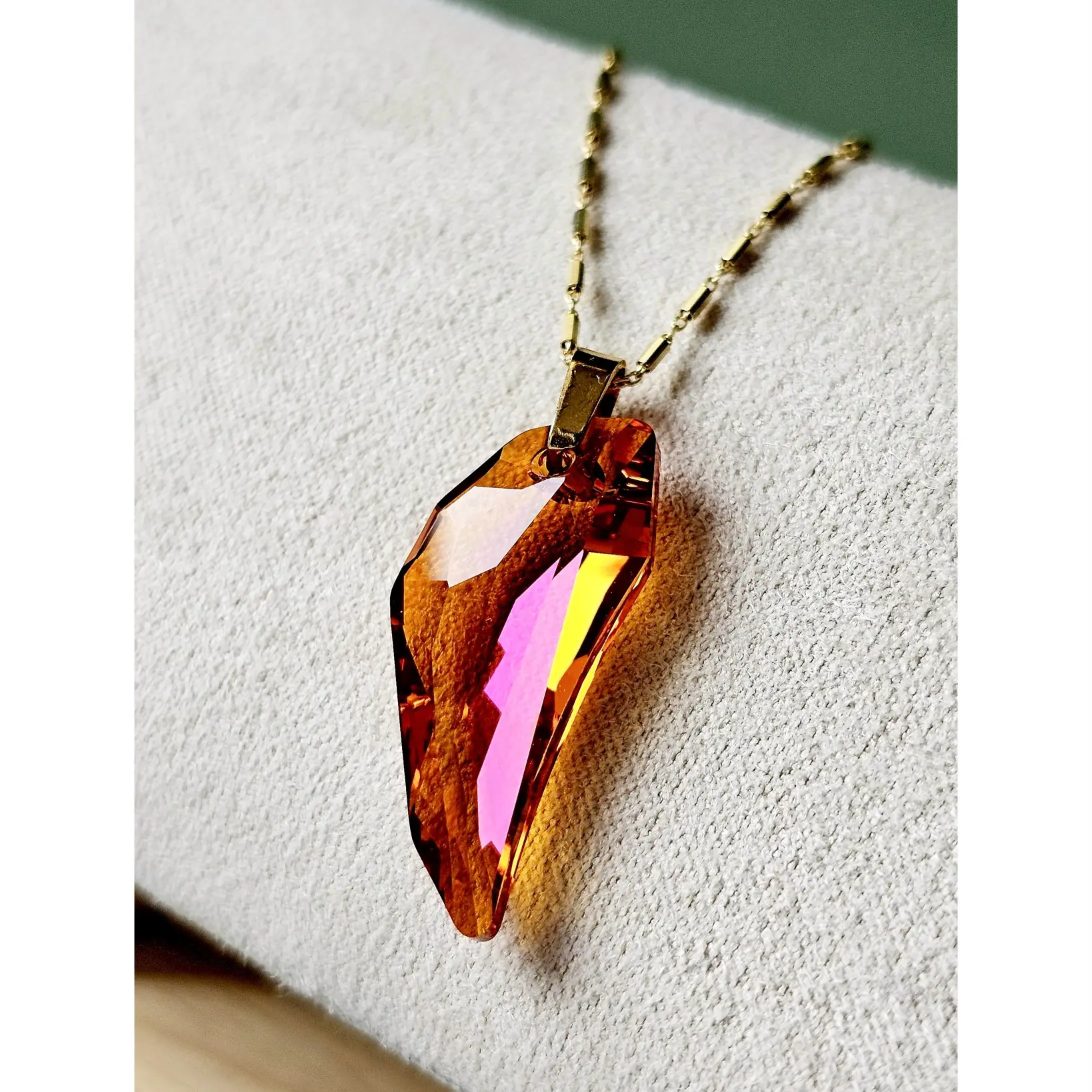 Ogrlica sa izražajnim Pegasus kristalom u astral pink efektu, mješavini crvene i naranđaste sa pink refleksijom i box lančićem sa pozlatom unosi dozu glamura u poslovne i svečane prilike. Dužine 30mm, privjesak spada u srednje velike i jako primjetne komade. Elegantni box lančić standardne dužine 45cm i širine 2mm je izrađen od 925 srebra sa dugotrajnom zlatnom galvanizacijom.