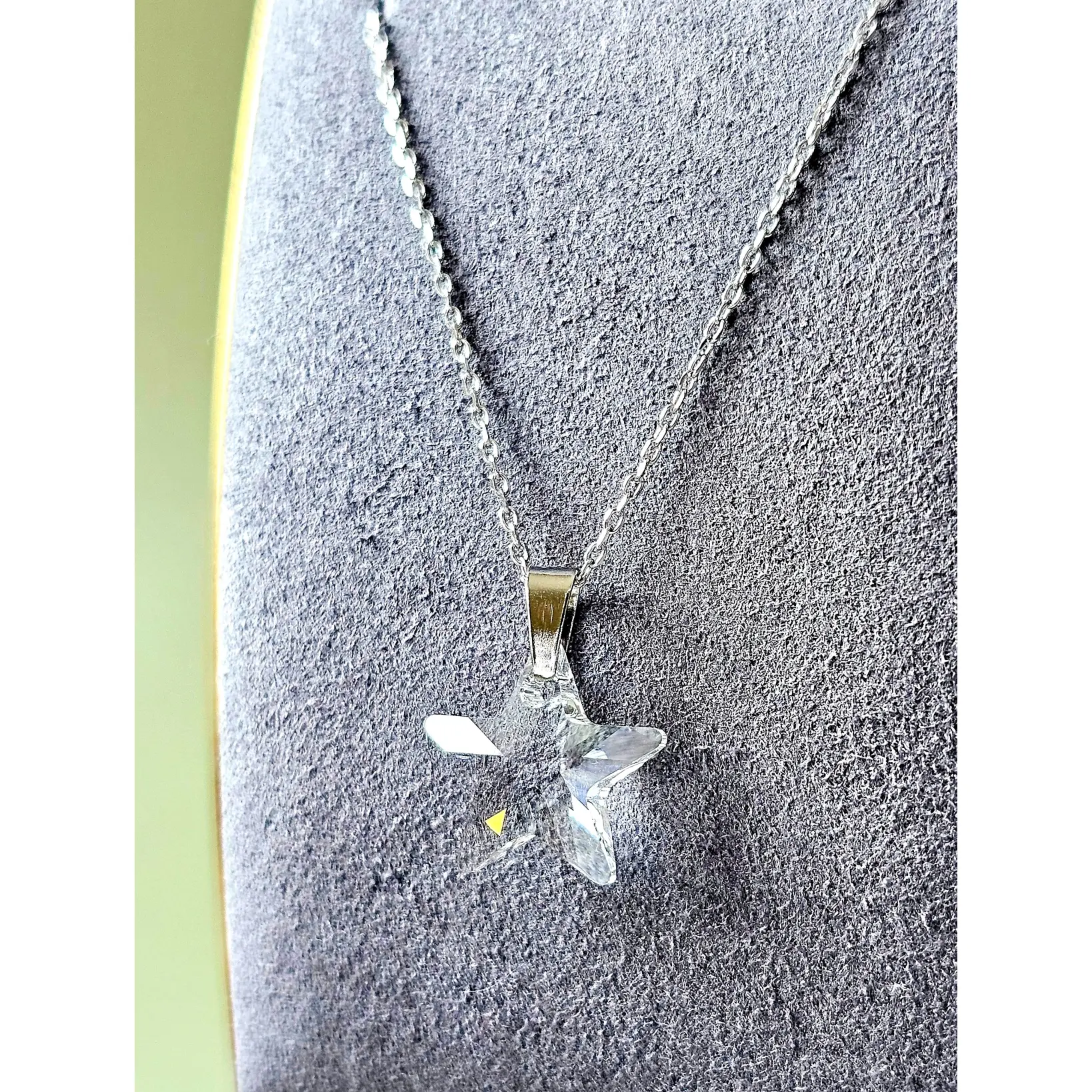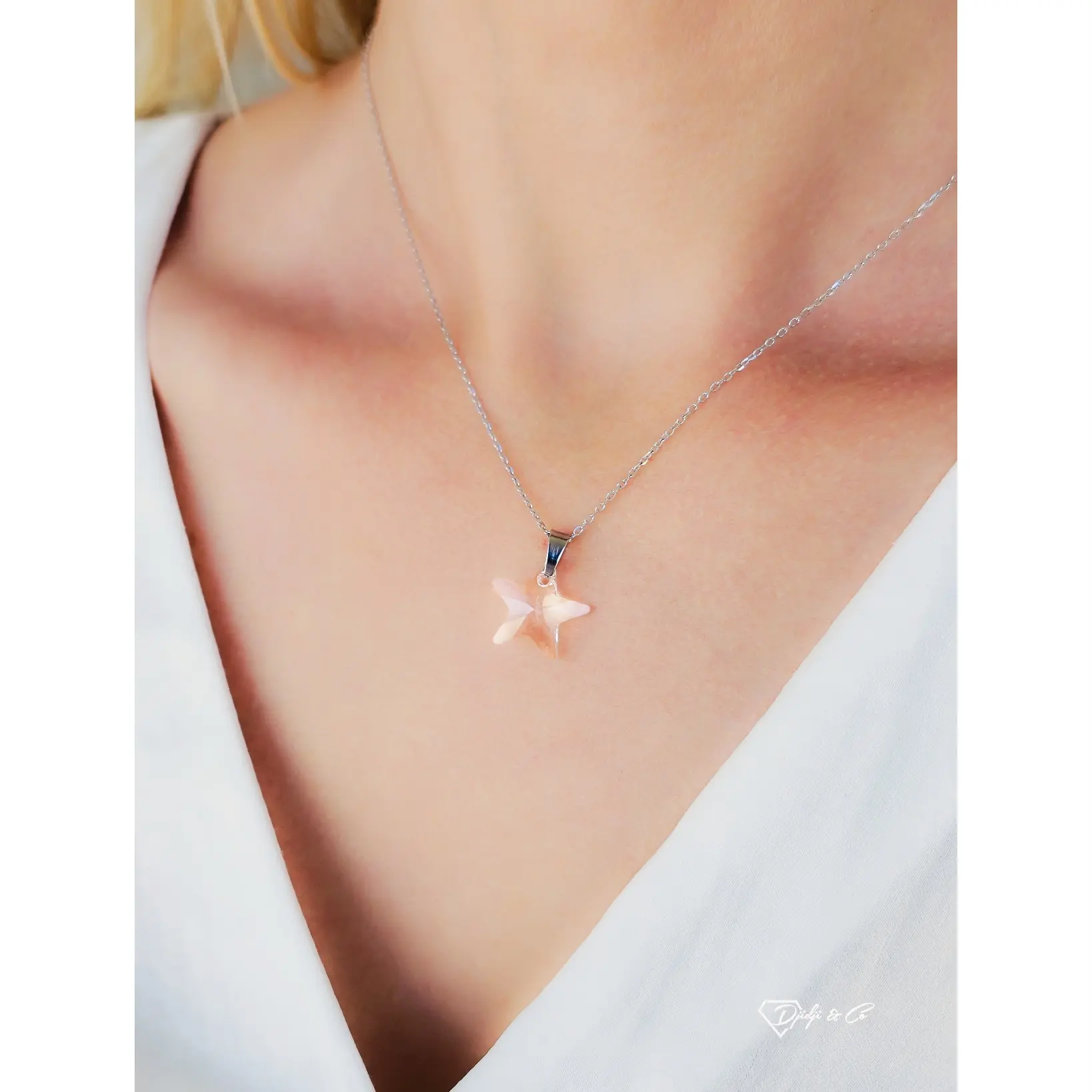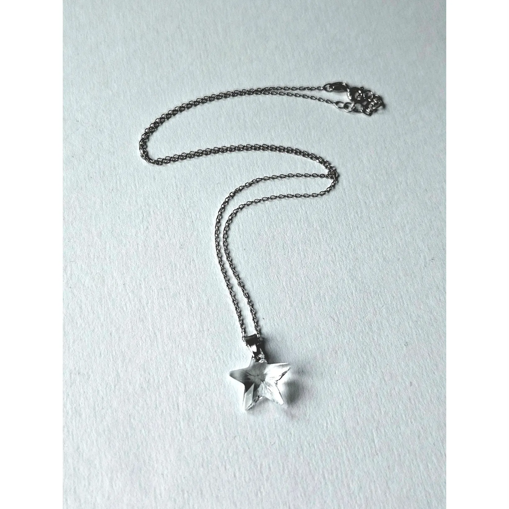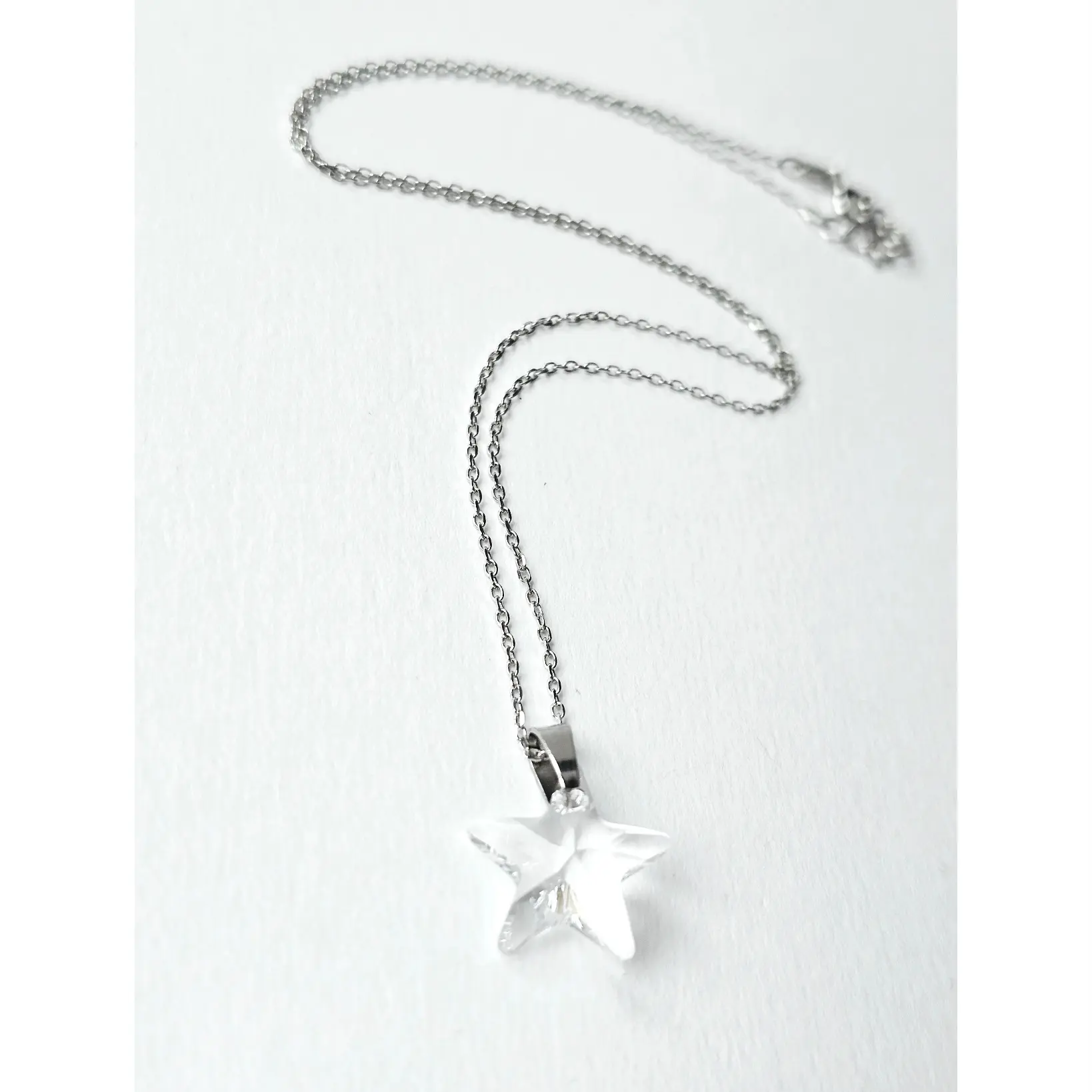 Ogrlica sa srednje velikim transparentnim kristalom u obliku zvjezde u tonu sa metalnim komponentama boje rodiranog srebra. Bezbojni kristal se odlično uklapa u svakodnevne odjevne kombinacije i unosi dozu gracioznosti čineći ovu ogrlicu izuzetno privlačnom. Usklađen sa box lančićem boje rodiuma, ovaj komad će unijeti dozu stila u svakodnevne te poslovne i svečane prilike.