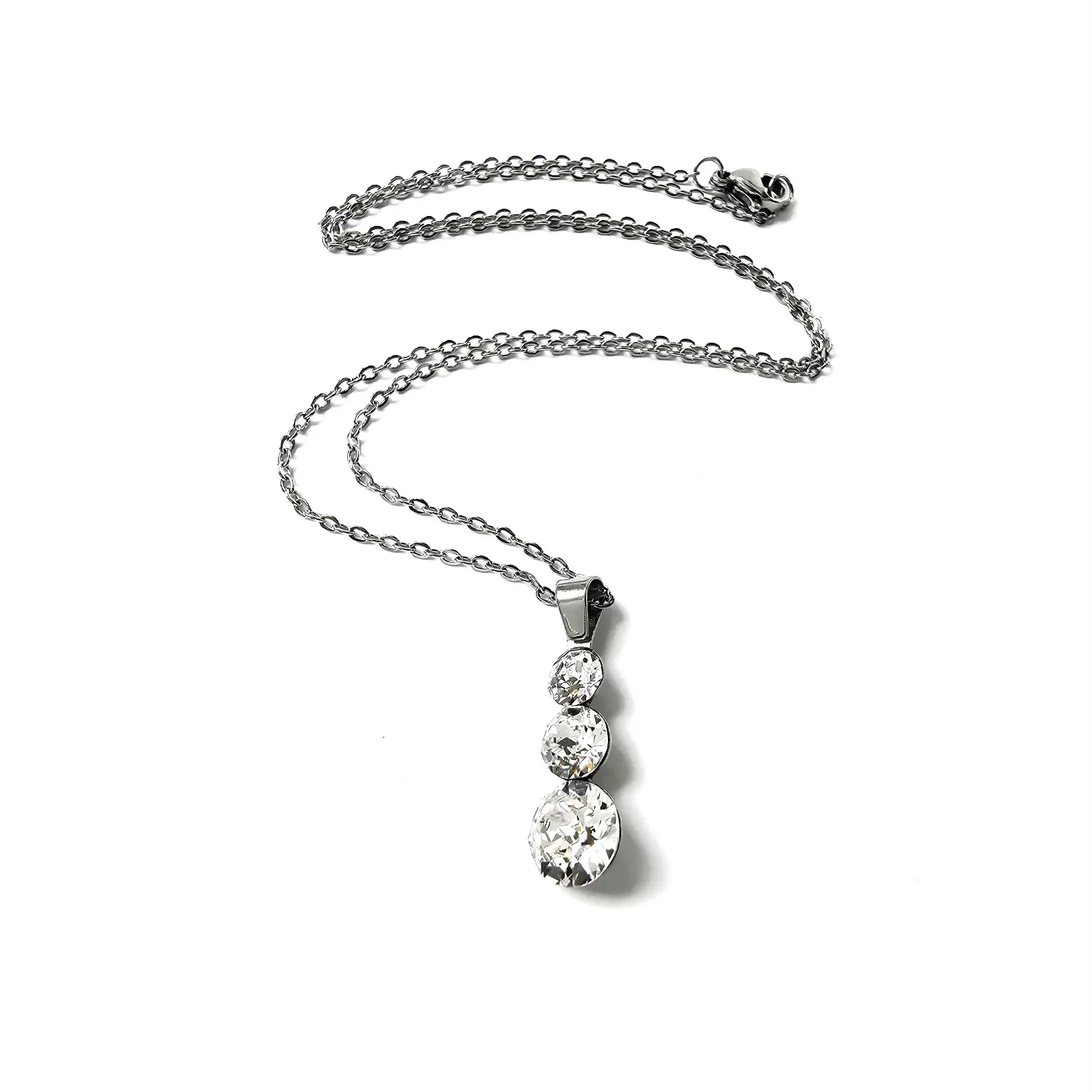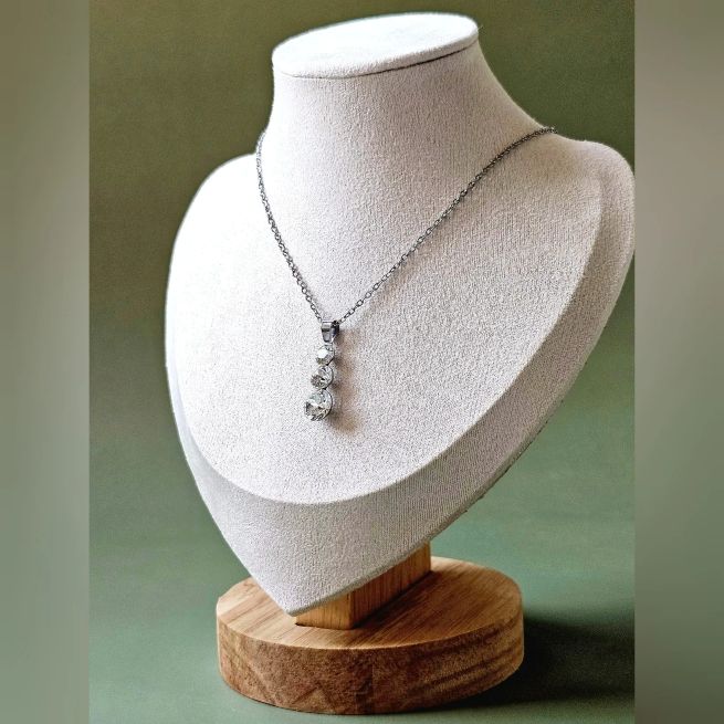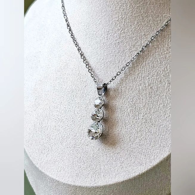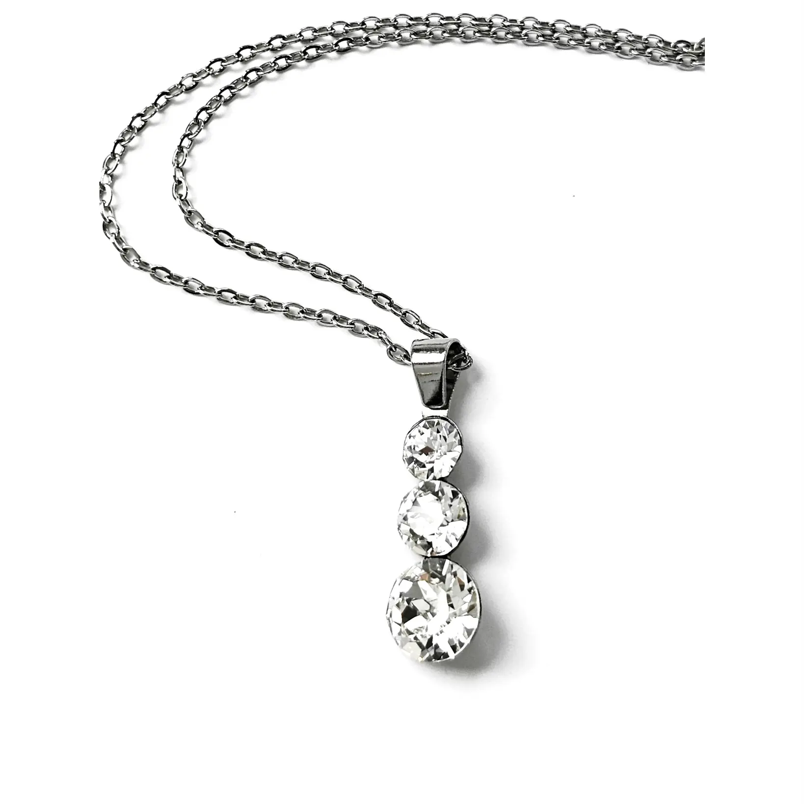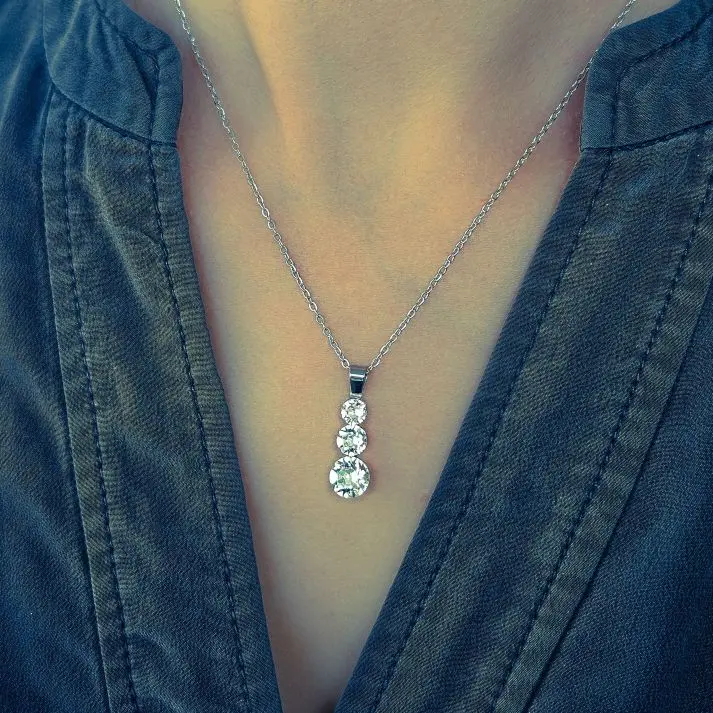 Ogrlica za svakodnevno nošenje sa srednje velikim privjeskom sa tri okrugla kamena šatona u omiljenoj, osnovnoj bezbojnoj varijanti te lančićem od neoksidirajuće metalne legure. Privlačan i jednostavan izgled, praktičnost, vrhunski materijal i lako održavanje čine ovu ogrlicu odličnim izborom. Flat oval lančić je varenih linkova i originalnog platinastog tona bez premaza, debljine je 1.5mm i standardne dužine 45cm sa jakom i ugodnom kopčom. Savršeno fasetirano kamenje promjera 5, 6 i 8mm privlaći svjetlosnom refleksijom i uz minimalan izvor svjetlosti te se uklapa u svakodnevni outfit te svečana izdanja.