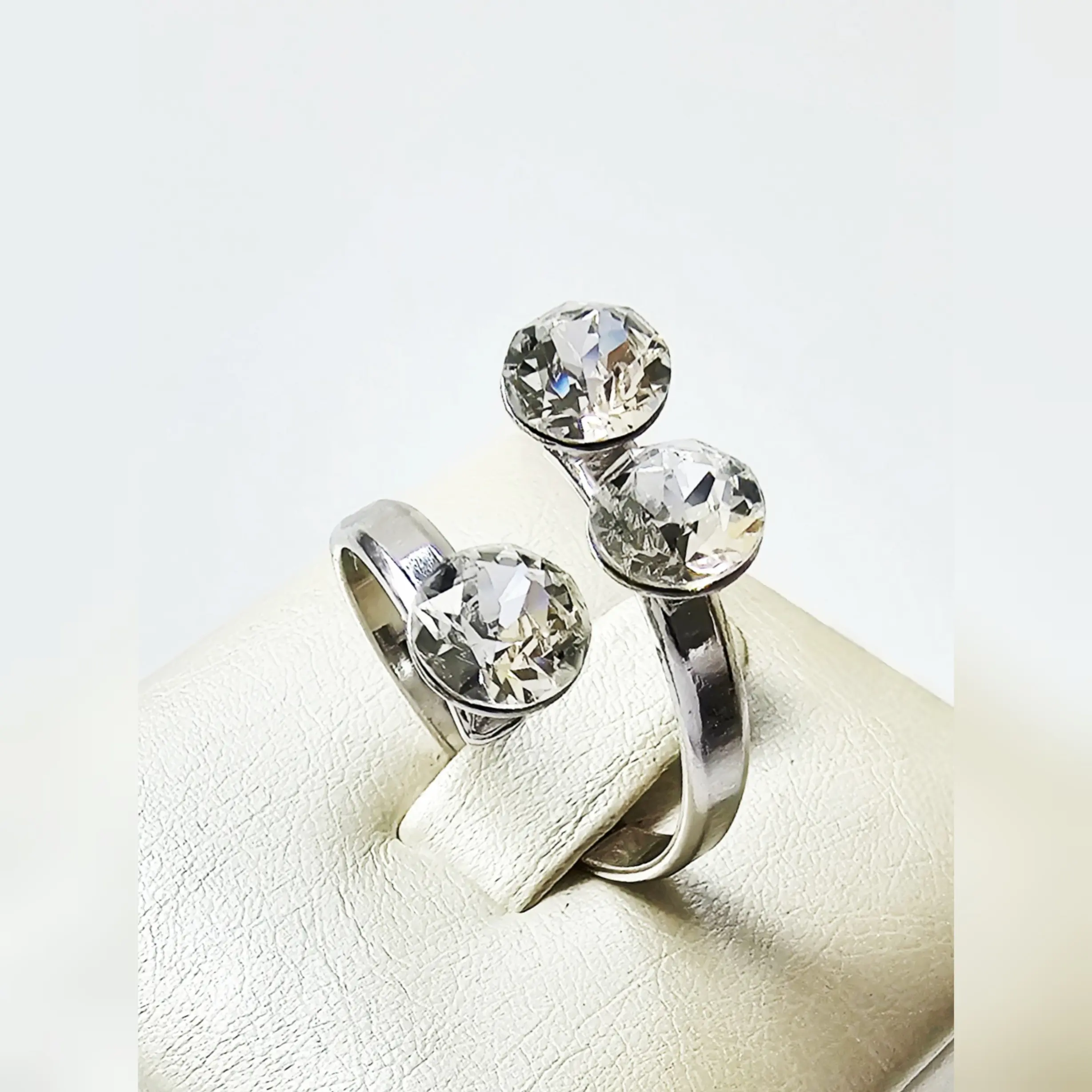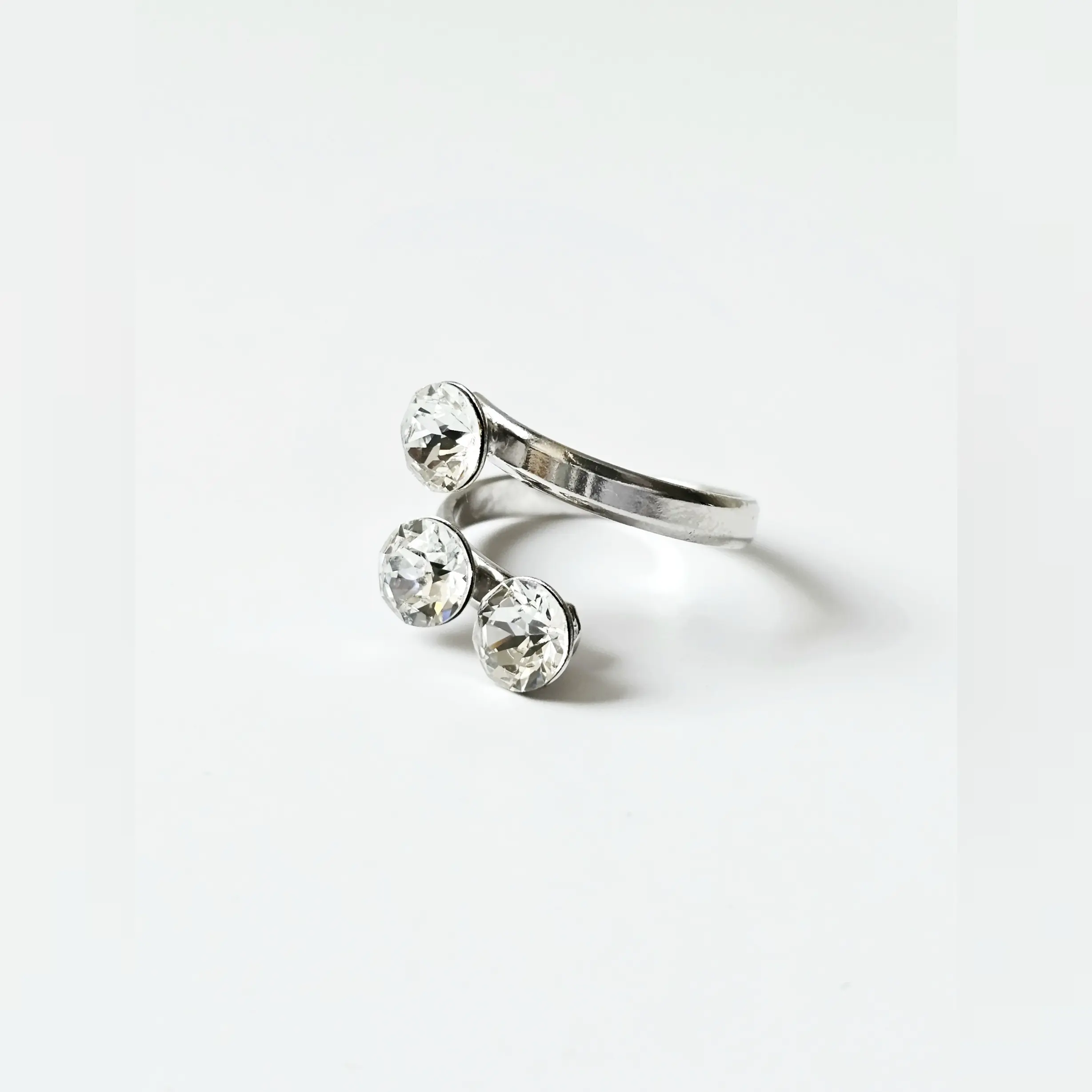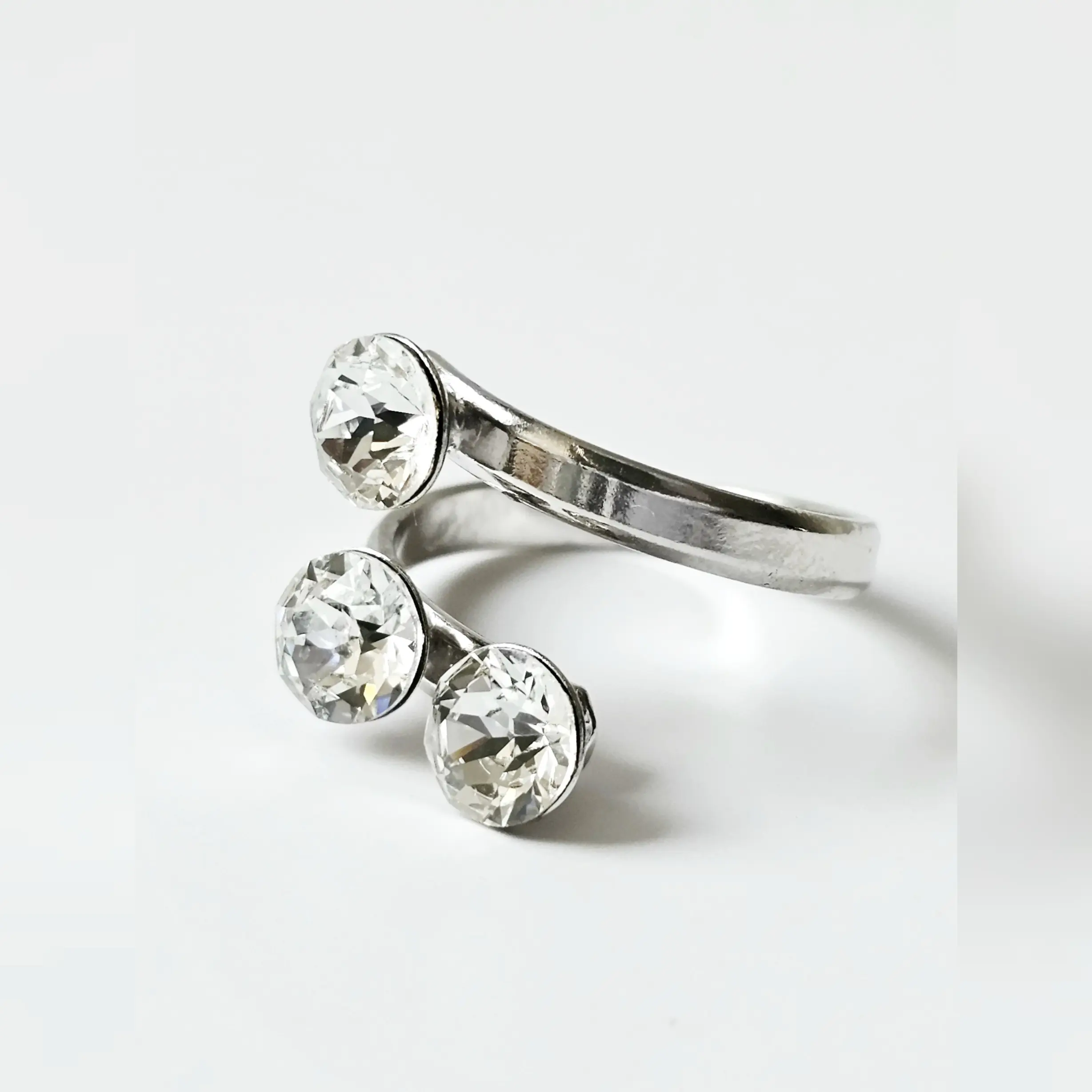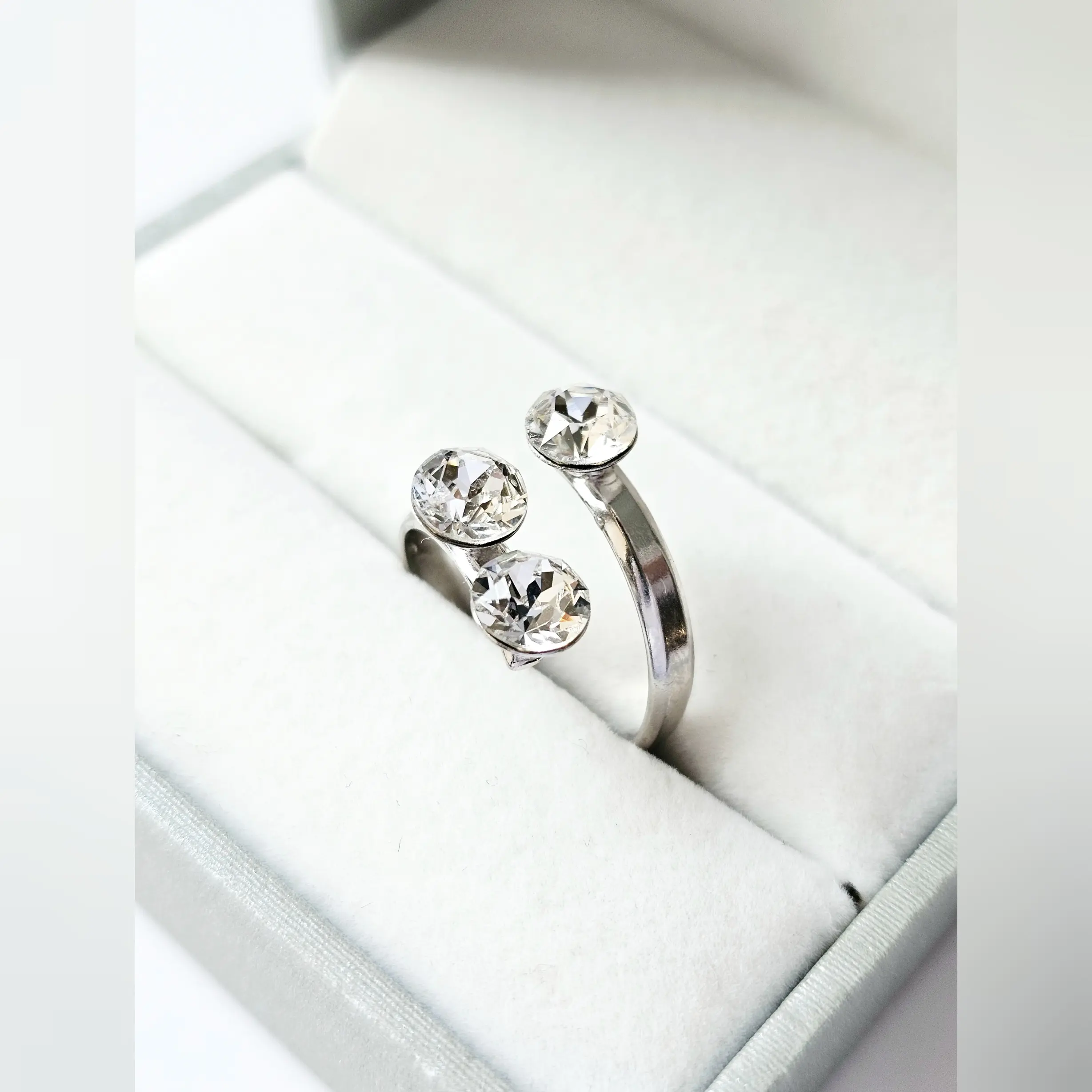 Poluotvoreni obruč i tri svjetlucava kamena u osnovnoj, bezbojnoj varijanti uhvaćeni u podlogu od rodiranog srebra fasetirani da stvaraju prekrasan odsjaj. Pored bezbojnih kristala širine 6mm, prsten Trio Crystal odlikuju podesiva veličina obruča te vrhunsko 925 srebro sa svijetlom rodium galvanizacijom. Obruč sa podesivom širinom se može suziti ili povečati u zavisnosti od prsta na kojem se nosi. Namijenjen za poslovne i svečane prilike ovaj elegantni prsten je namijenjen starijima od 18 godina.