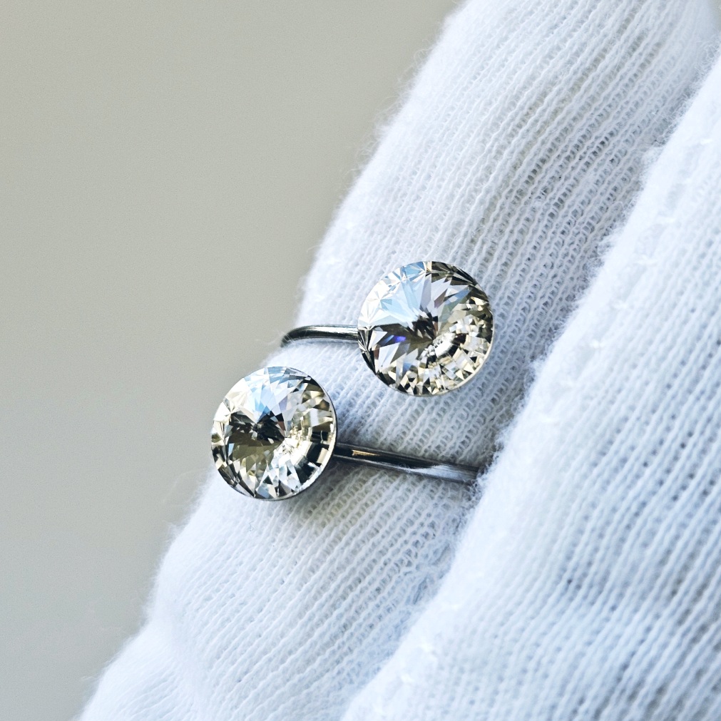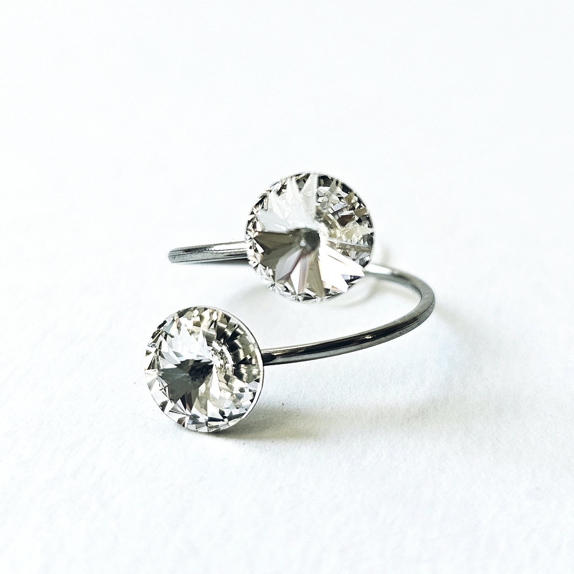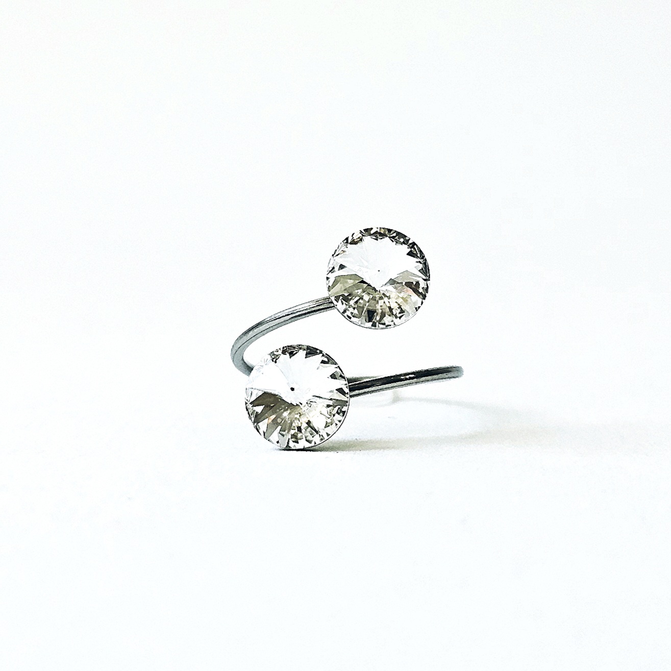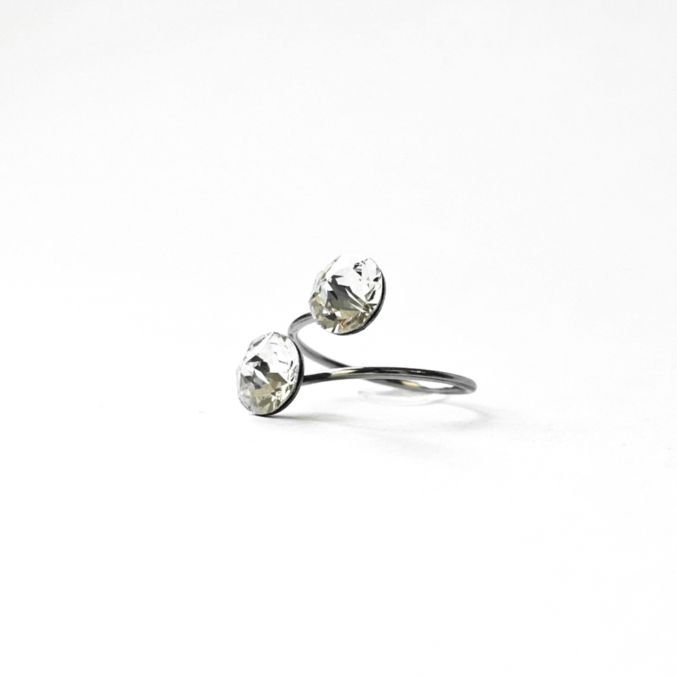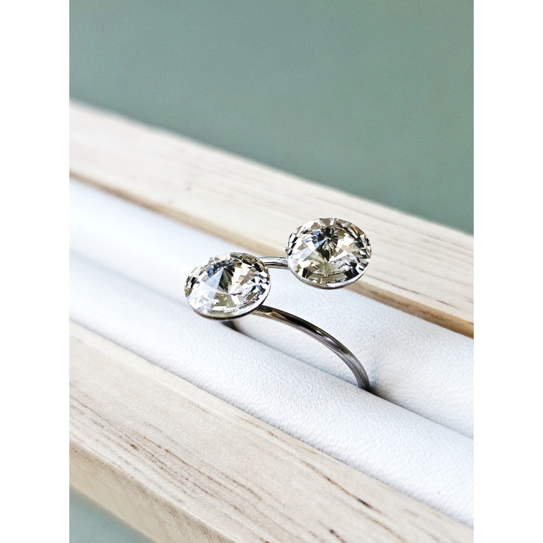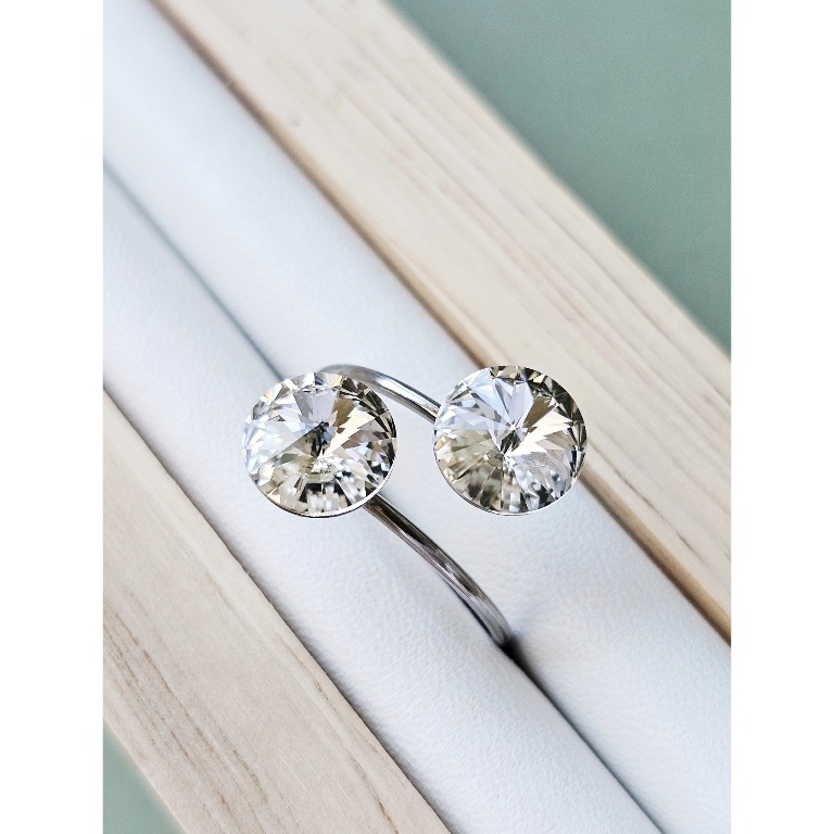 Prsten sa dva kristala istih veličina ukalupljen u obruč prilagodljiv po širini. Kamenje promjera 8 mm u osnovnoj, bezbojnoj varijanti te rivoli fasetom, dok je obruč izrađen od hipoalergenske metalne legure. Pored boje kristala koja se lako uklapa sa ostalim modnim dodacima i garderobom, ovaj prsten odlikuju veličina kamenja, podesiva veličina obruča te neoksidirajuća metalna komponenta sa dugogodišnjom garancijom kvalitete materijala. Obruč se može suziti ili povećati u zavisnosti od prsta na kojem se nosi. Namijenjen svečanim i poslovnim prilikama, starijima od 16 godina.
