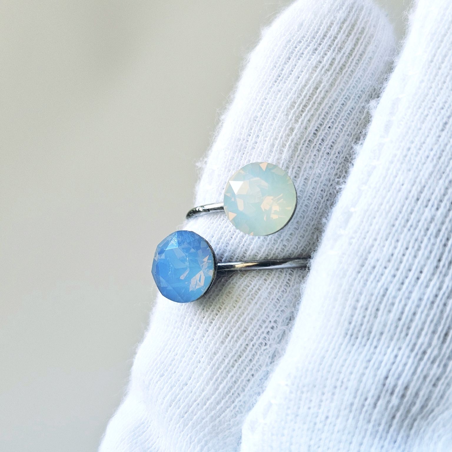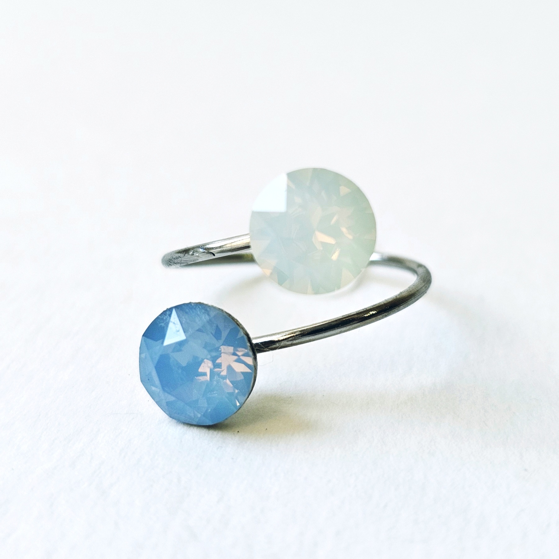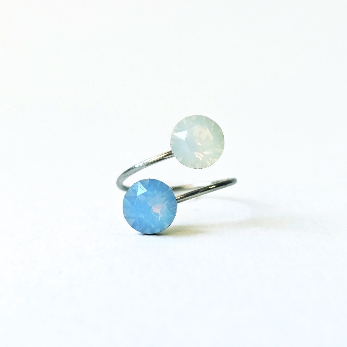Prsten sa dva kristala istih veličina ukalupljen u obruč prilagodljiv po širini. Kamenje promjera 8 mm u toniranim bojama plavog i bijelog opala e klasičnim šaton fasetom, dok je obruč izrađen od hipoalergenske metalne legure. Pored boje kristala koja se lako uklapa sa ostalim modnim dodacima i garderobom, ovaj prsten odlikuju veličina kamenja, podesiva veličina obruča te neoksidirajuća metalna komponenta sa dugogodišnjom garancijom kvalitete materijala. Obruč se može suziti ili povećati u zavisnosti od prsta na kojem se nosi. Namijenjen svečanim i poslovnim prilikama, starijima od 16 godina.