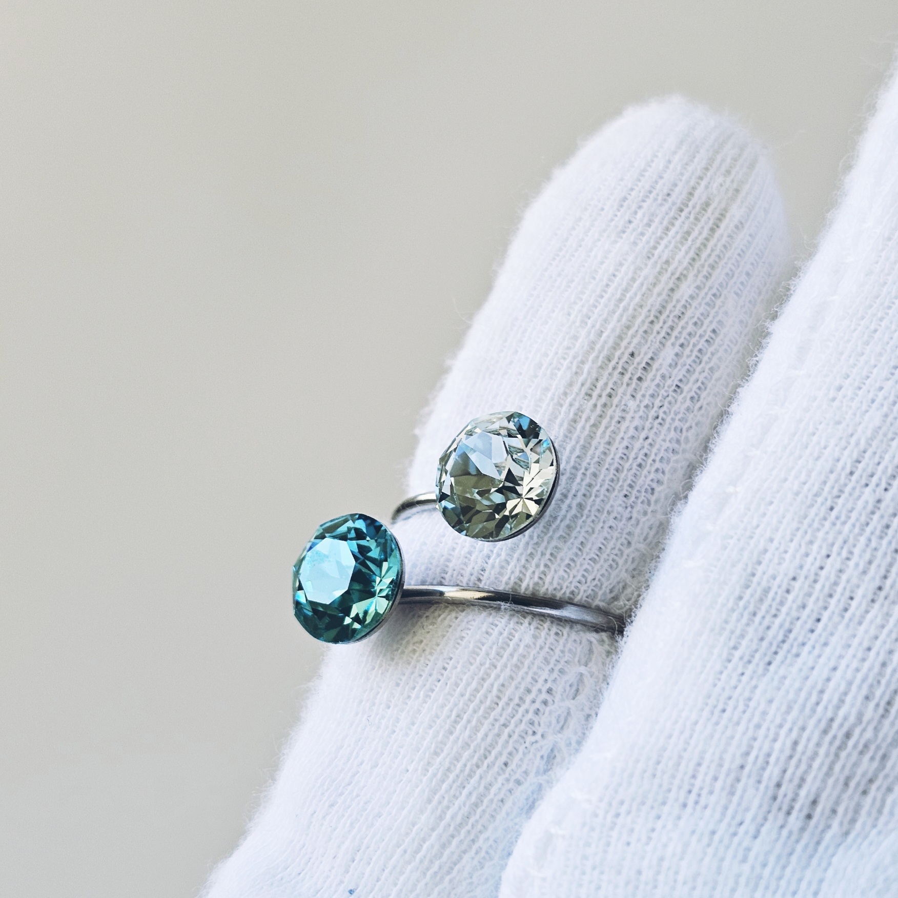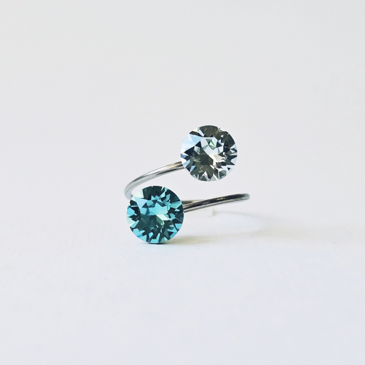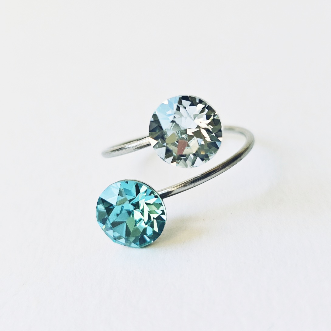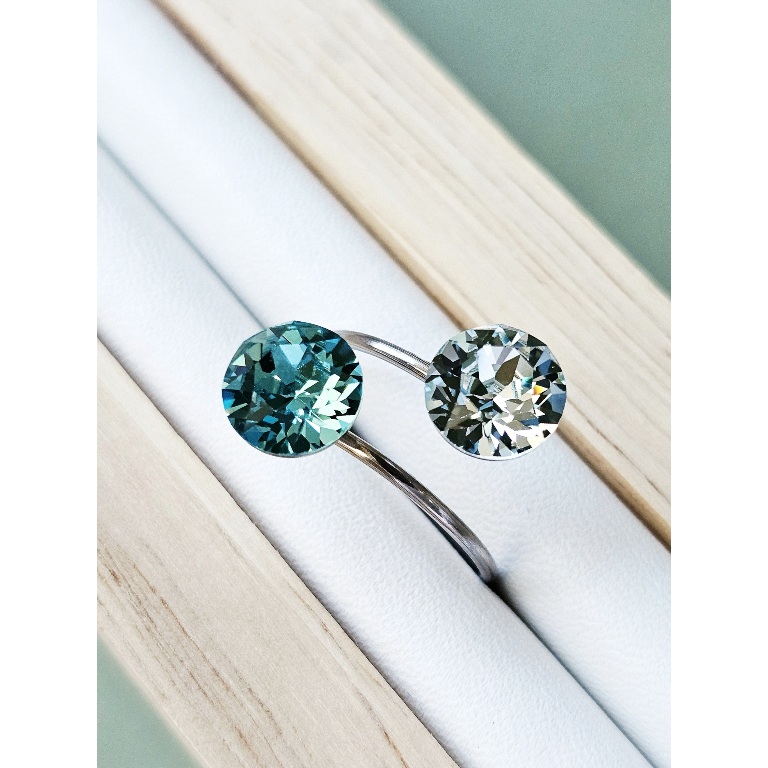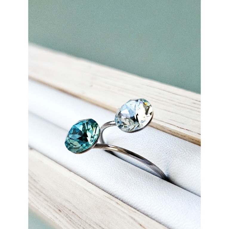 Prsten sa dva kristala istih veličina ukalupljen u obruč prilagodljiv po širini. Kamenje promjera 8 mm u toniranim bojama, tirkiz i svjetlo azurno plava te klasičnim šaton fasetom, dok je obruč izrađen od hipoalergenske metalne legure. Pored boje kristala koja se lako uklapa sa ostalim modnim dodacima i garderobom, ovaj prsten odlikuju veličina kamenja, podesiva veličina obruča te neoksidirajuća metalna komponenta sa dugogodišnjom garancijom kvalitete materijala. Obruč se može suziti ili povećati u zavisnosti od prsta na kojem se nosi. Namijenjen svečanim i poslovnim prilikama, starijima od 16 godina.