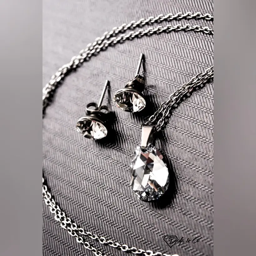 Privlačan i jednostavan izgled, praktičnost, vrhunski materijal i lako održavanje čine ovaj set odličnim izborom. Kombinacija naušnica na šaraf sa okruglim kamenjem u osnovnoj, bezbojnoj varijanti i lančića sa privjeskom u obliku badema i omiljenom bezbojnom efektu srerene komete. Flat oval lančić je varenih linkova i originalnog platinastog tona bez premaza, debljine je 1.5mm i standardne dužine 45cm sa jakom i ugodnom kopčom. Savršeno fasetirano kristal vel. 16mm privlaći srebrenkastom svjetlosnom refleksijom. Uz nenametljive naušnice na šaraf širine 6mm, ovaj set se savršeno uklapa u svakodnevne aktivnosti, od poslovnih do svečanih. Namijenjen osobama starijim od 16 god.
