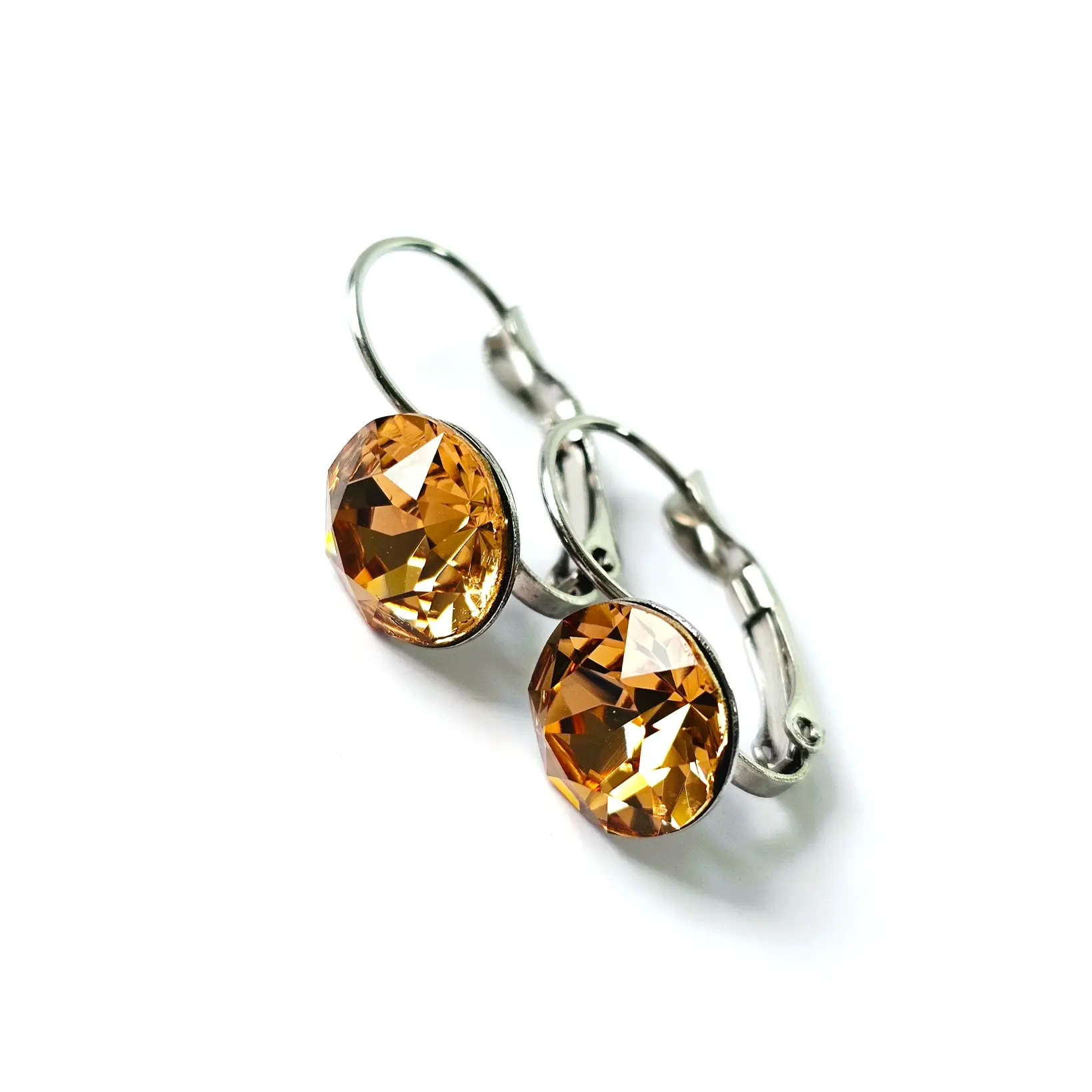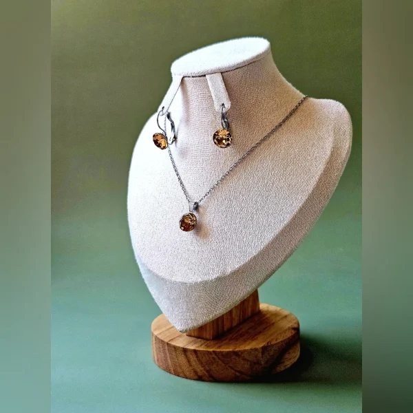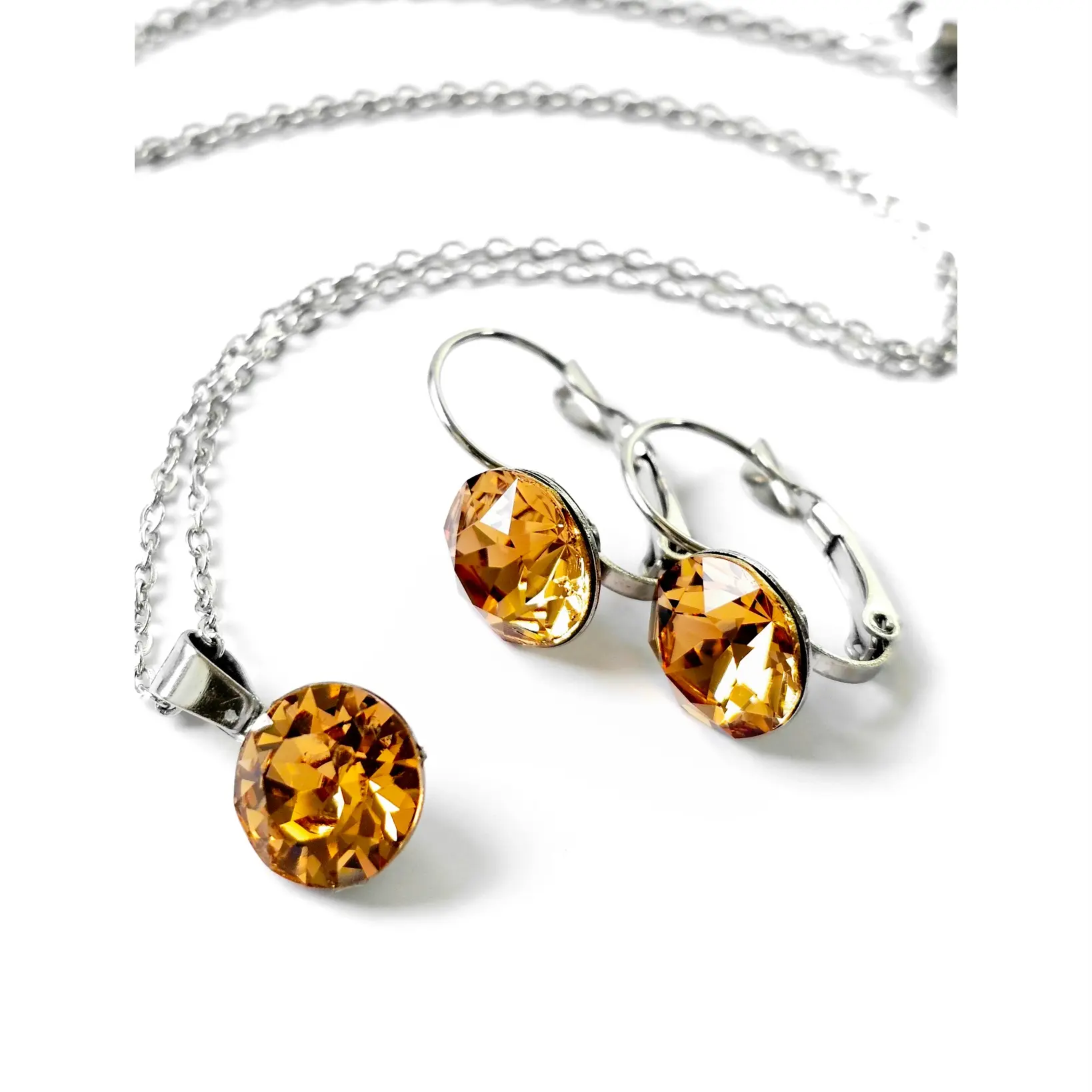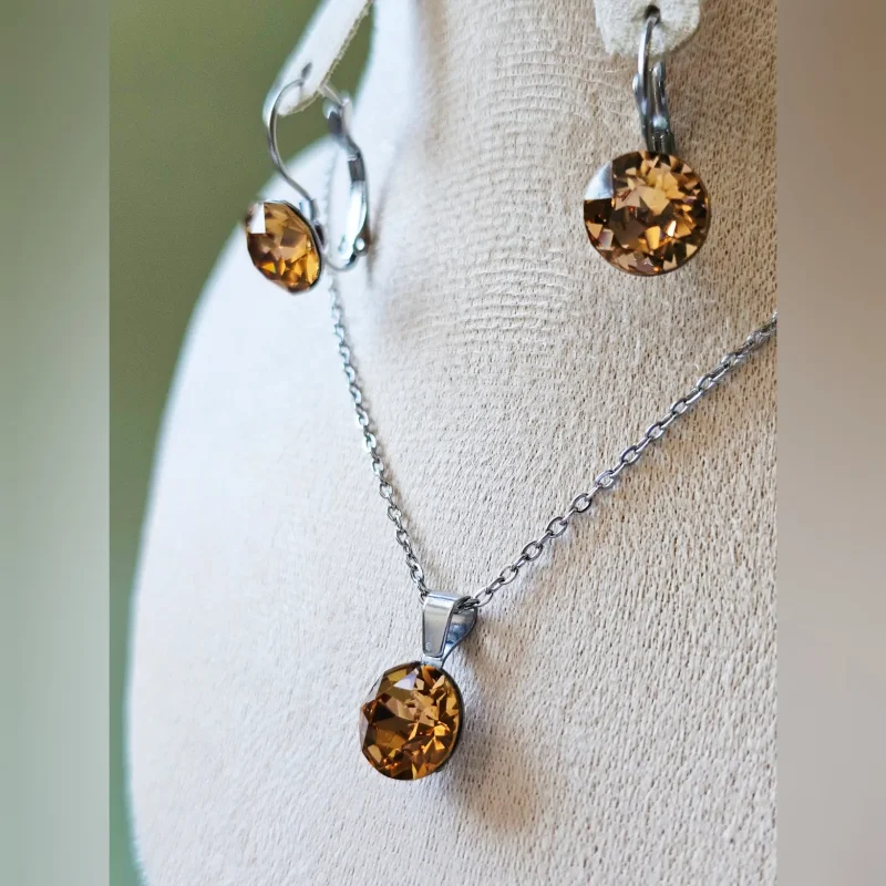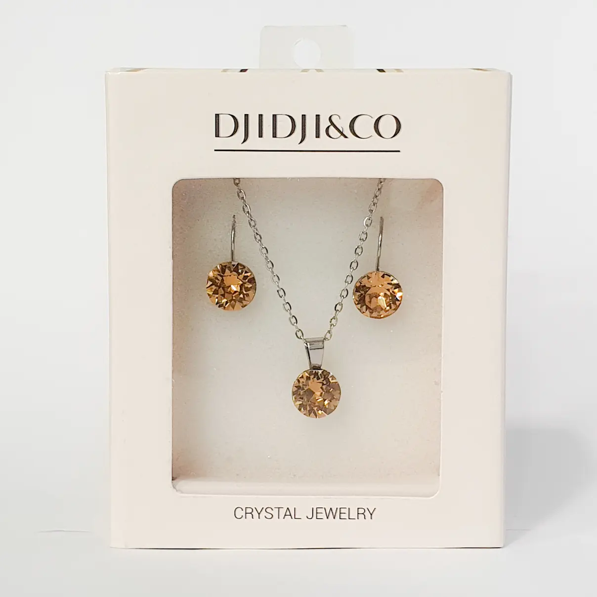 Set sa blago visećim naušnicama i ogrlicom brenda Djidji & Co koristite za svakodnevne te poslovne ili svečane prilike. Okrugli kamen u boji svjetlog topaza očarava veličinom i količinom faseta. Ukalupljen u originalne metalne komponente sa sigurnosnim kopčanjem. Privjesak srednje veličine na lančiću se odlično uklapa u svakodnevni izgled. Namijenjen za svakodnevne situacije, pored vrhunski fasetiranih kristala, ovaj set krase hipoalergenske komponente otporne na uvjete te lako održavanje u kućnim uvjetima. Dužina naušnica je 20mm, širina je 10mm. Lančić originalnog platinastog tona bez premaza je debljine 1.5mm i standardne dužine 45cm sa jakom i ugodnom kopčom.