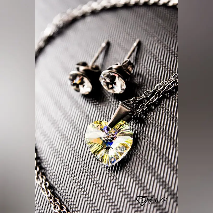 Kombinacija bezbojnog okruglog kamena šatona i privjeska u obliku srca u svijetlom aurora boreale efektu, mješavinom prozirne, plave i zlatne, ukalupljen u originalne metalne komponente. Naušnice sa kopčanjem na šaraf širine 6mm te privjesak srce vel. 10mm na lančiću se odlično uklapa u svakodnevni izgled. Pored vrhunski fasetiranih kristala, ovaj minimalistički set krase hipoalergenske komponente otporne na uvjete te lako održavanje u kućnim uvjetima. Dužina naušnica je 13mm, širina je 6mm. Lančić originalnog platinastog tona bez premaza je debljine 1.5mm i standardne dužine 45cm sa jakom i ugodnom kopčom. Primjeren osobama starijim od 10 god.