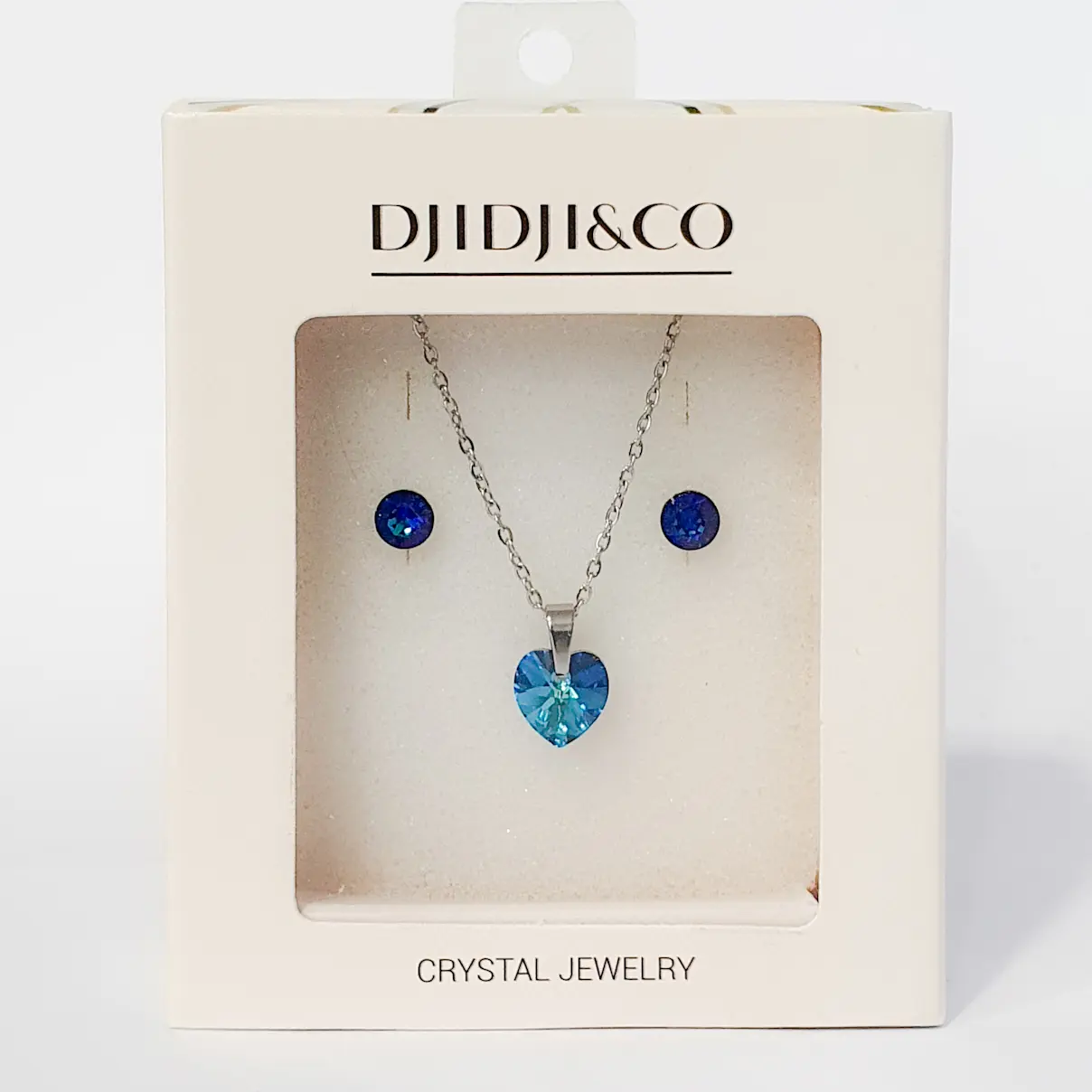 Kombinacija okruglog kamena šatona i privjeska u obliku srca bermuda plavom efektu, sa plavom i tirkiznom refleksijom, ukalupljen u originalne metalne komponente. Naušnice sa kopčanjem na šaraf širine 6mm te privjesak srce vel. 10mm na lančiću se odlično uklapa u svakodnevni izgled. Pored vrhunski fasetiranih kristala, ovaj minimalistički set krase hipoalergenske komponente otporne na uvjete te lako održavanje u kućnim uvjetima. Dužina naušnica je 13mm, širina je 6mm. Lančić originalnog platinastog tona bez premaza je debljine 1.5mm i standardne dužine 45cm sa jakom i ugodnom kopčom. Primjeren osobama starijim od 10 god.